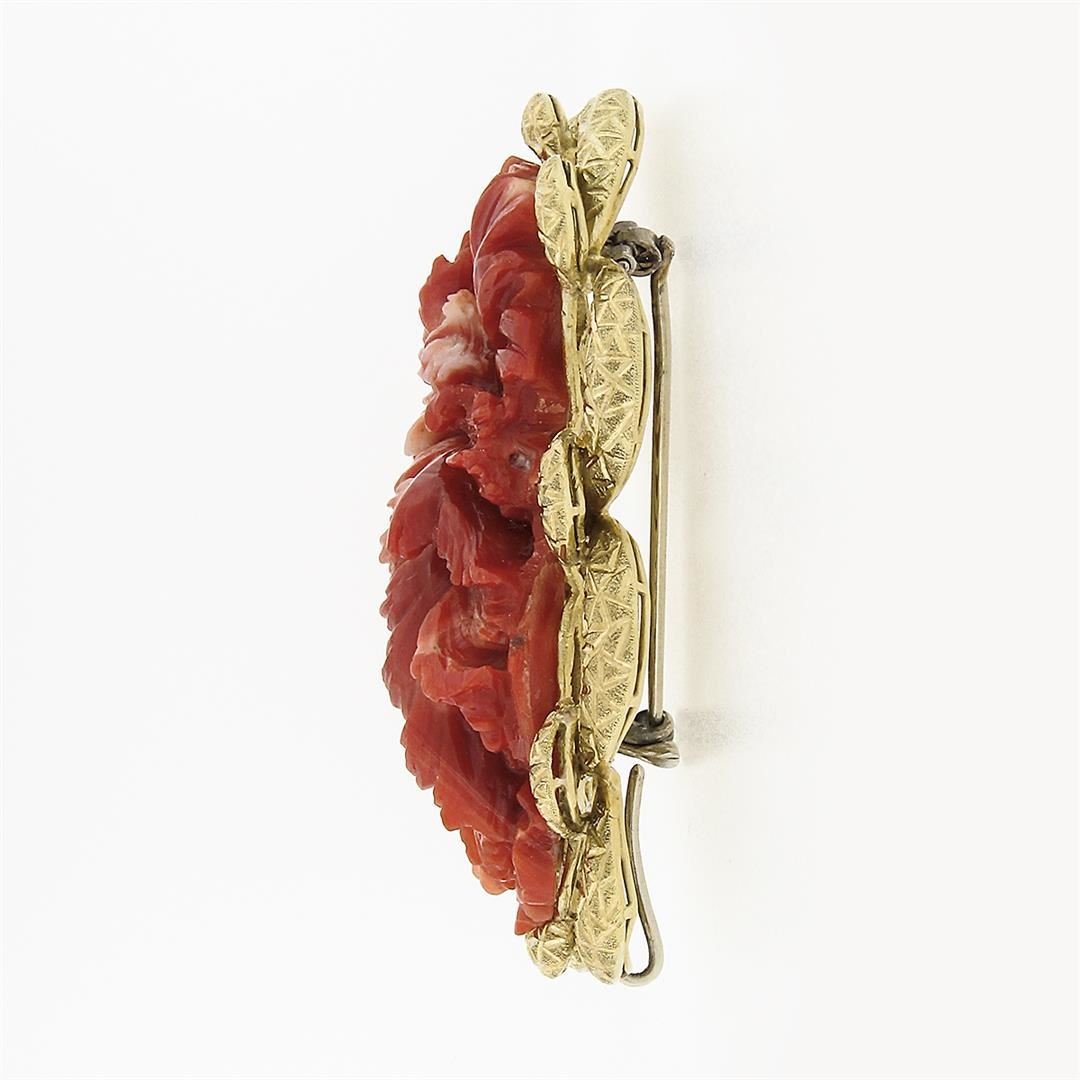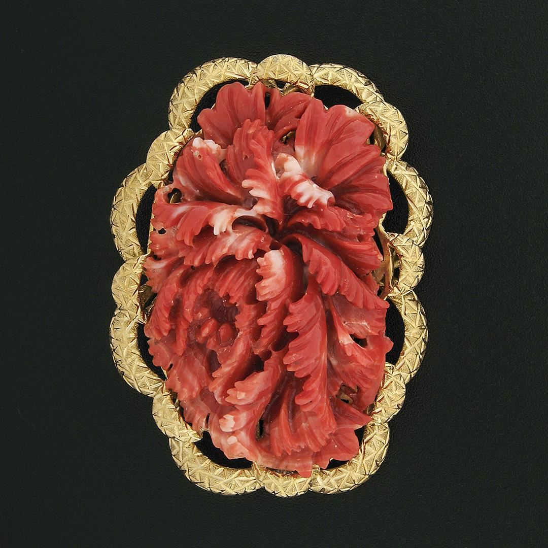 A vintage solid 18k yellow gold large pin brooch, with 1 Gia certified no dye carved natural coral ( 55.39x33.80mm). Measures 62.12x45.95mm and weighs a total of 47.52 grams. Comes with all original relevant certifications.