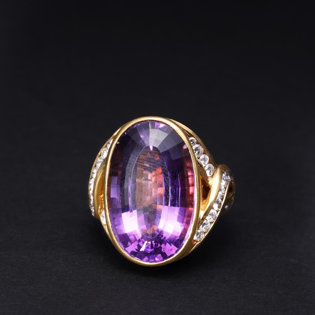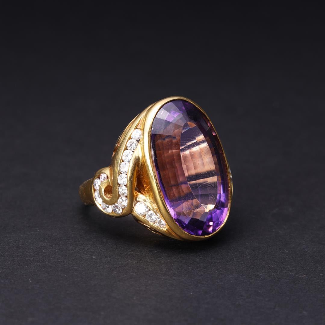Large and elaborate 18k yellow gold cocktail ring; center set with large oval amethyst and diamond accents to shoulders with openwork, marked 18k to interior; gross weight 22.1 g, size 7 3/4