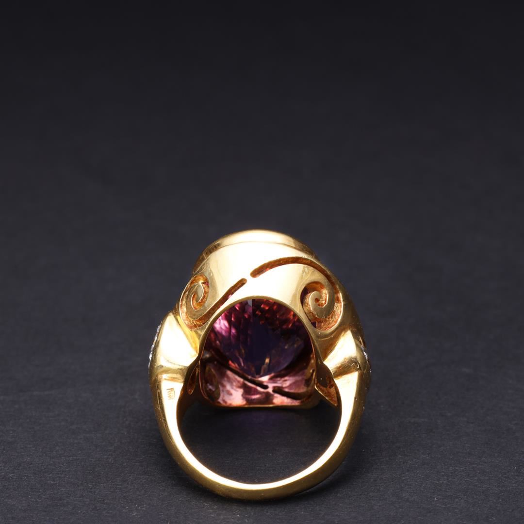 Large and Elaborate 18K Yellow Gold Amethyst & Diamond Cocktail Ring containing one oval amethyst 22.5mm x 14.5mm weighing approximately 19 cts. Thirty round brilliant weighing approximately 0.35 cts. Total weight of ring is 22 gm. Estimated retail value