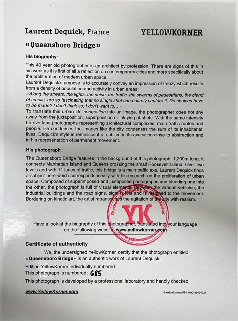Laurent Dequick france Queensboro Bridge YellowKorner Certified Photograph. Certificate of Authenticity from YellowKorner affixed to the back. Matted Dimensions 16"x20". Protected with Clear Mylar Sleeve.