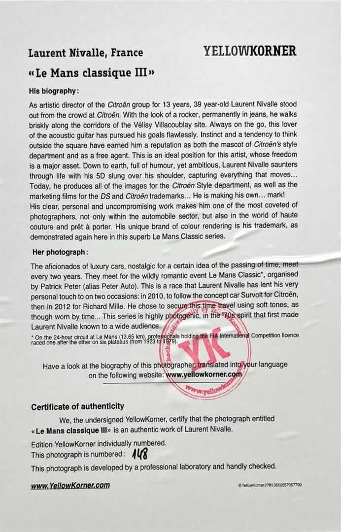Laurent Nivalle Le Mans Classique III Sports Race Car France YellowKorner Certified Photograph. Certificate of Authenticity from YellowKorner affixed to the back. Matted Dimensions 16"x20". Protected with Clear Mylar Sleeve.