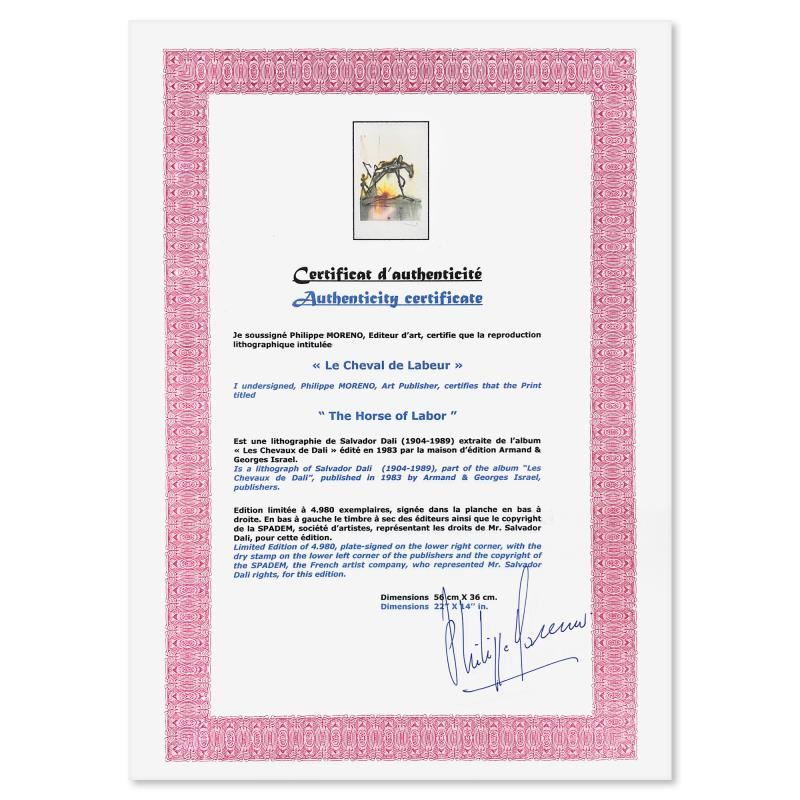 "Le Cheval de Labeur (The Horse of Labor)" is a limited edition lithograph by Salvador Dali (1904-1989), bearing the plate signature of the artist. This piece was published by Armand & Georges Israel in 1983 during Dali's lifetime and under his supervision. This piece was printed on Velin D'arches paper in Paris. This work is referenced in The Official Catalog of the Graphic Works of Salvador Dali (Albert Fields). This piece comes custom framed. Includes Certificate of Authenticity. Measures approx. 20" x 28" (frame), 14" x 22" (image).