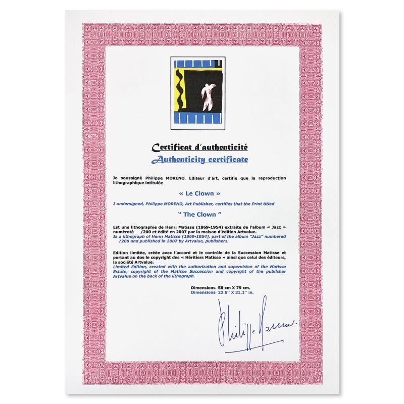"Le Clown (The Clown)" is a limited edition lithograph by Henri Matisse (1869-1954). This piece comes from an edition of 200 authorized by the Matisse Estate; the edition number is not on the piece itself but on the certificate. This piece comes custom framed. Includes Certificate of Authenticity. Measures approx. 29" x 37" (frame), 23" x 31" (image).
