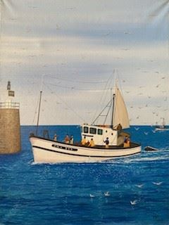 A charming 18x24" original acrylic painting of a small fishing boat ; with Fanch's COA,