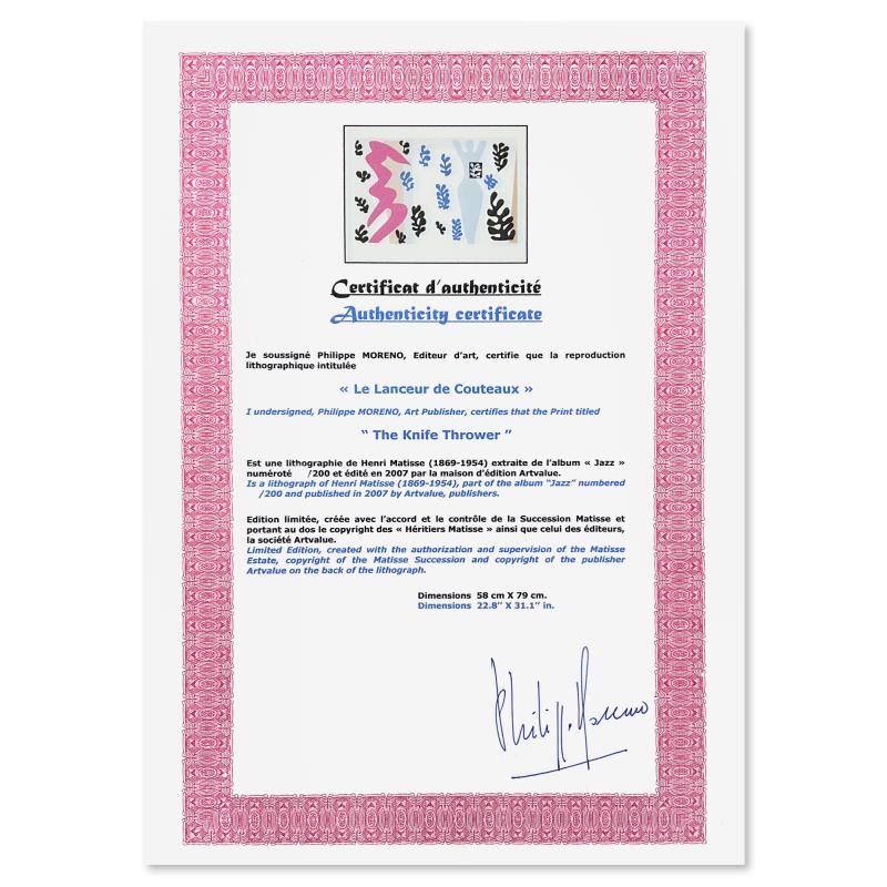 "Le Lanceur de Couteaux (The Knife Thrower)" is a limited edition lithograph by Henri Matisse (1869-1954). This piece comes from an edition of 200 authorized by the Matisse Estate; the edition number is not on the piece itself but on the certificate. This piece comes custom framed. Includes Certificate of Authenticity. Measures approx. 37" x 29" (frame), 31" x 23" (image).