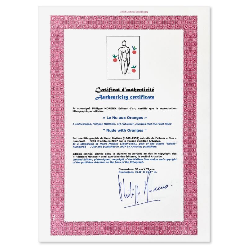 "Le Nu aux oranges" is a limited edition lithograph by Henri Matisse (1869-1954) bearing the plate signature of the artist. This piece comes from an edition of 200 authorized by the Matisse Estate; the edition number is not on the piece itself but on the certificate. This piece comes custom framed. Includes Certificate of Authenticity. Measures approx. 28.5" x 37" (frame), 22.5" x 31" (image).