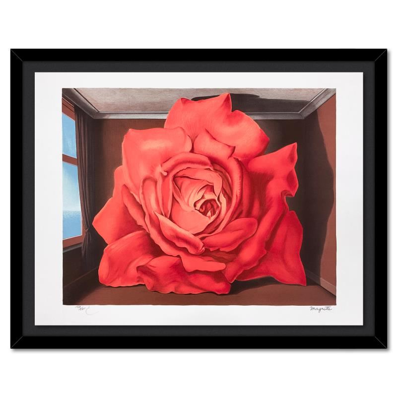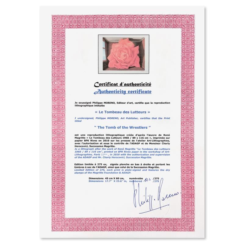 "Le Tombeau des Lutteurs (The Tomb of the Wrestlers)" is a limited edition lithograph by Rene Magritte (1898-1967). This piece is numbered 122/275 and bears the dry stamps of the Magritte Foundation & ADAGP (Society of Authors in the Graphic and Plastic Arts) and is signed by the President of the Magritte Foundation, Charly Herscovici. This piece comes custom framed. Includes Certificate of Authenticity. Measures approx. 29.5" x 24" (frame), 23.5" x 18" (image).