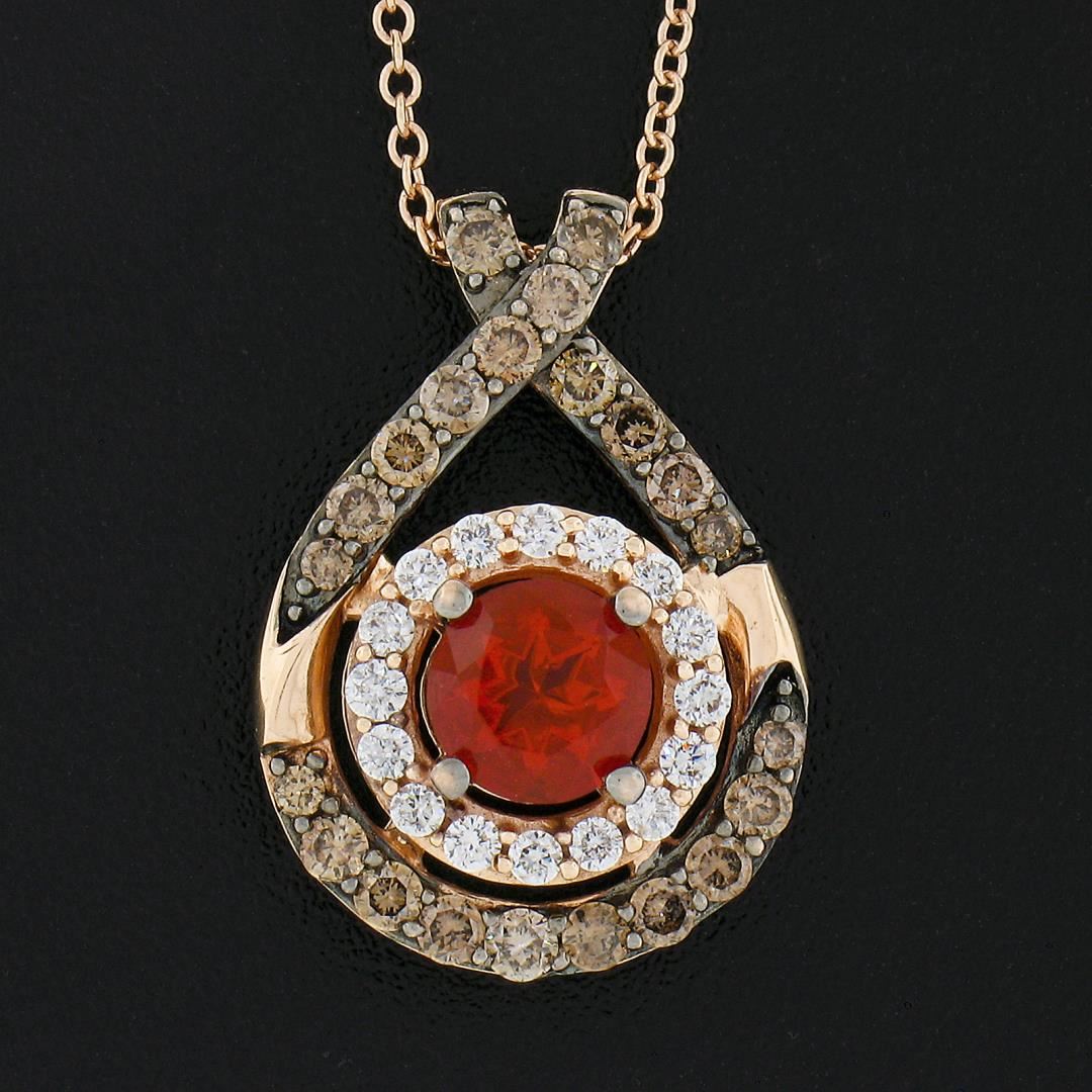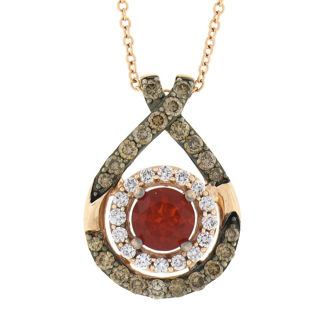 A solid 14k strawberry & rose gold pendant necklace by Le Vian, featuring 1 round cut natural fire opal (0.45ct), and 38 round cut natural diamonds (Fancy Brown & White - VS2/SI1 ; 0.75ctw). 18 inch cable link chain, 4.73 grams total weight, pendant measures 21.9x15.1mm.