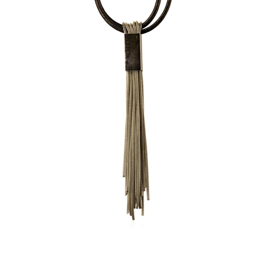 High end designer jewelry. Leather/Mesh Tassel Necklace - Rhodium Plated. Rhodium Plated Metal/3" Ext Clasp. Black/ Silver. 20/8inches.
