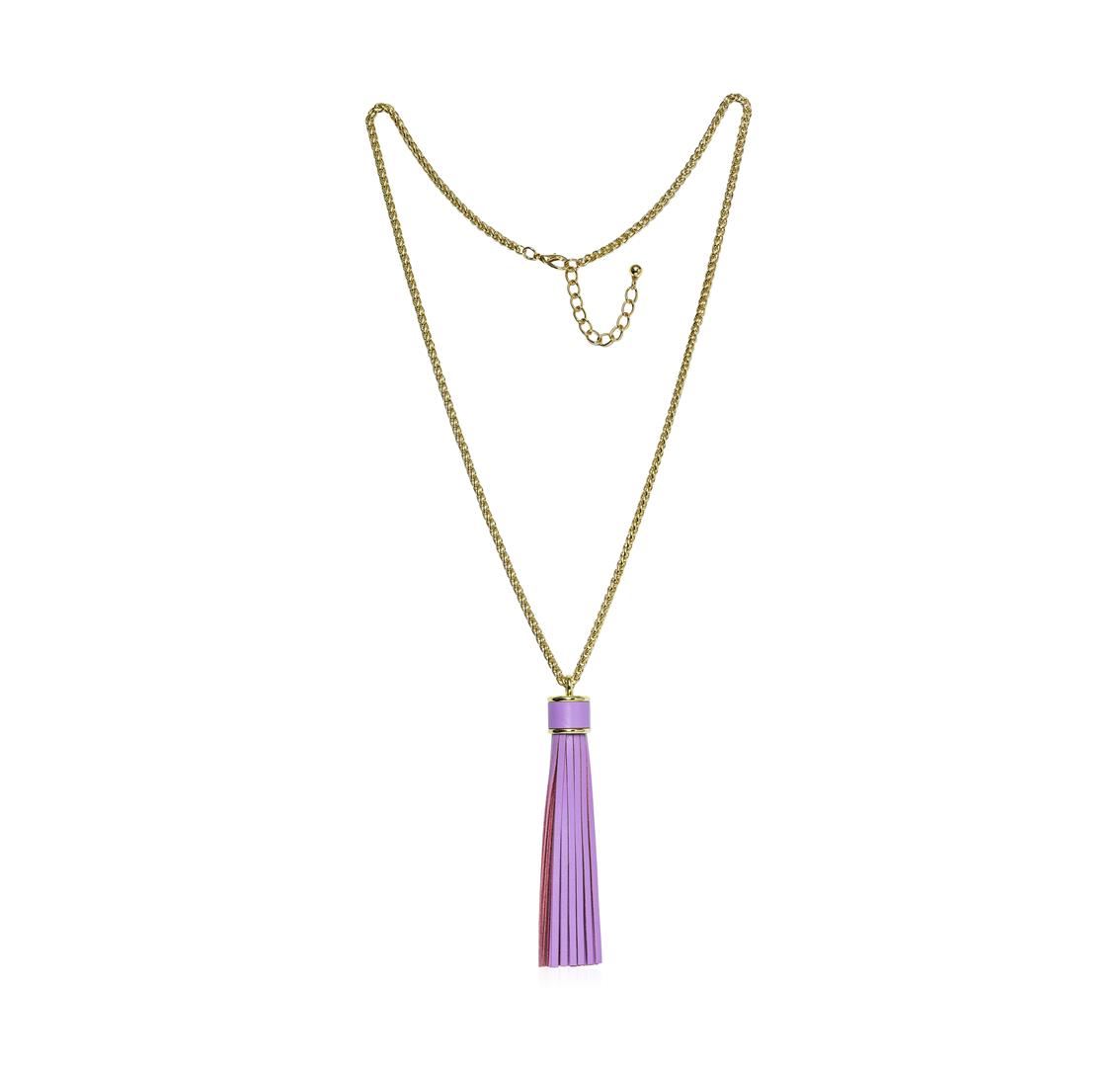 High end designer jewelry. Leather Tassel Chain Necklace - Gold Plated. Gold Plated Metal/3" Ext Clasp. Lilac/ Gold. 32/5inches. Total Weight: 61.7 grams.