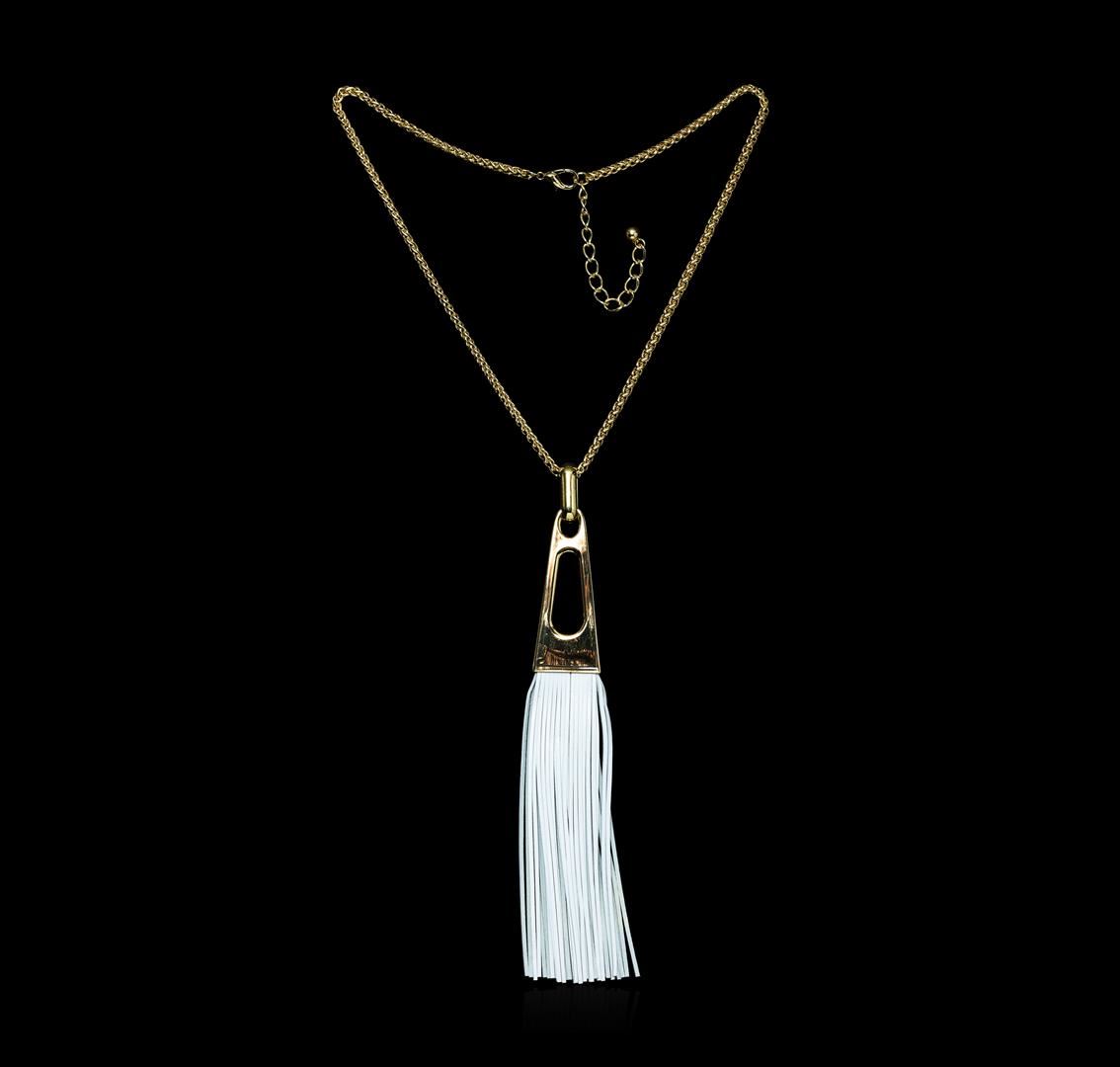 High end designer jewelry. Leather Tassel Chain Necklace - Gold Plated. Gold Plated Metal/3" Ext Clasp. White/gold. 22/8inches. Total Weight: 77 grams.