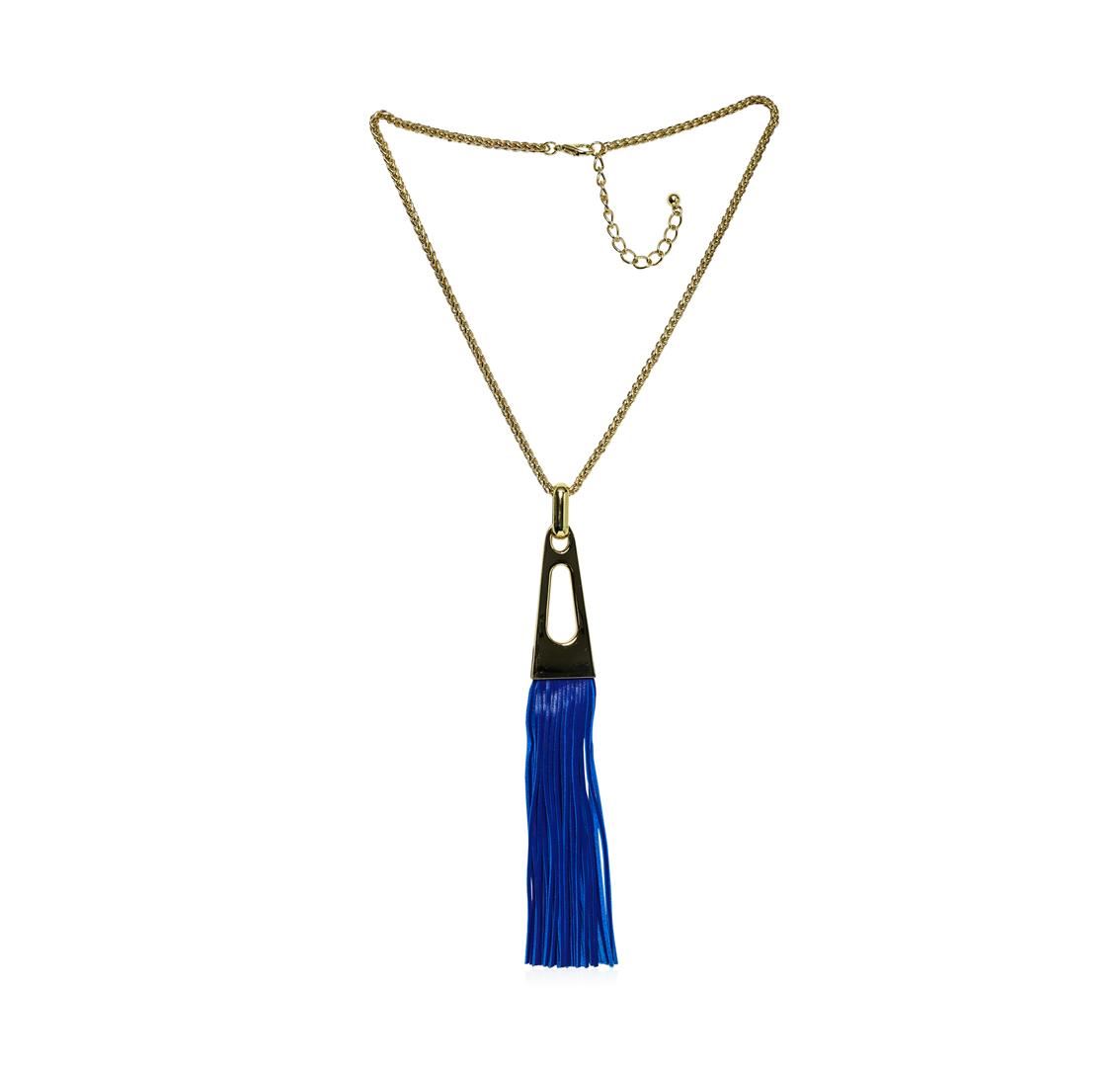 High end designer jewelry. Leather Tassel Chain Necklace - Gold Plated. Gold Plated Metal/3" Ext Clasp. Navy/ Gold. 22/8inches. Total Weight: 76.9 grams.