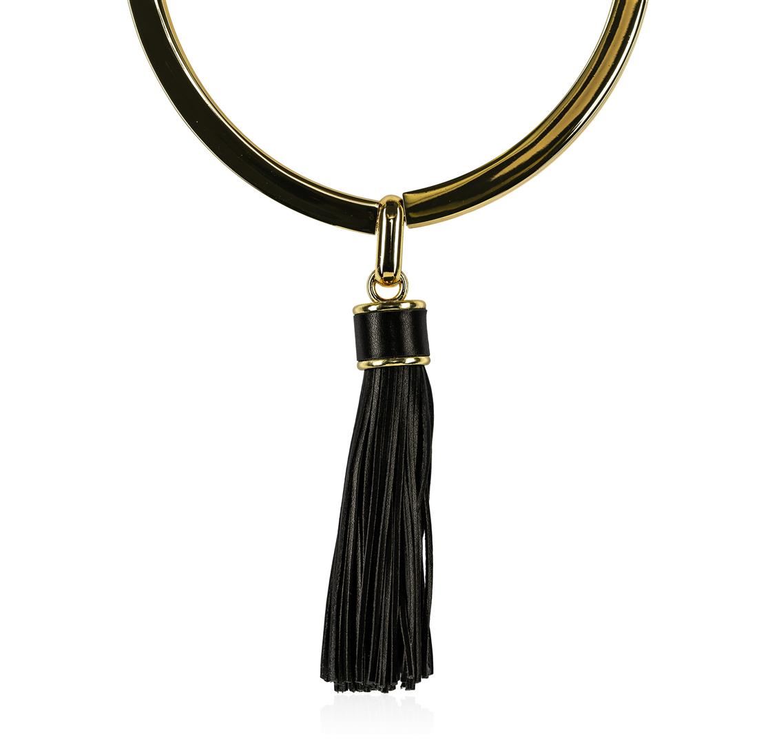 High end designer jewelry. Leather Tassel Pendant Necklace - Rhodium Plated. Gold Plated Metal/3.5" Ext Clasp. Black/ Gold. 18/5inches. Total Weight: 143.6 grams.