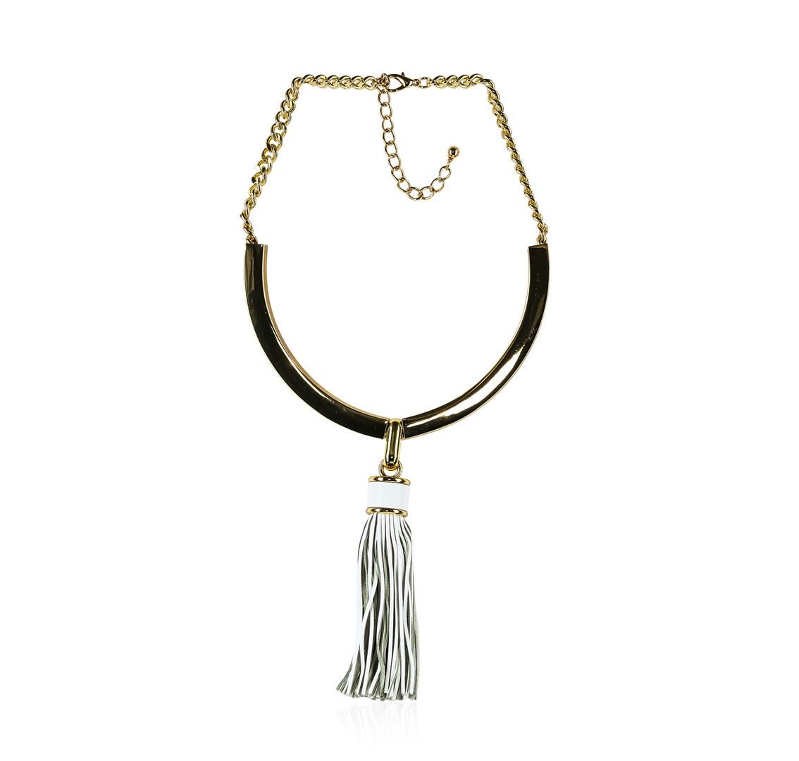 High end designer jewelry. Leather Tassel Pendant Necklace - Rhodium Plated. Gold Plated Metal/3.5 Ext Clasp. White/gold. 18/5 Inches. Total Weight: 159 grams.