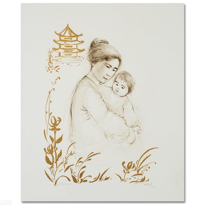 "Lei Jeigiong and her Baby in the Garden of Yun-Tai" is a limited edition lithograph on paper, numbered and hand signed by Edna Hibel (1917-2014). Includes Certificate of Authenticity! Measures approx. 20" x 26" (with border), 14" x 19" (image).