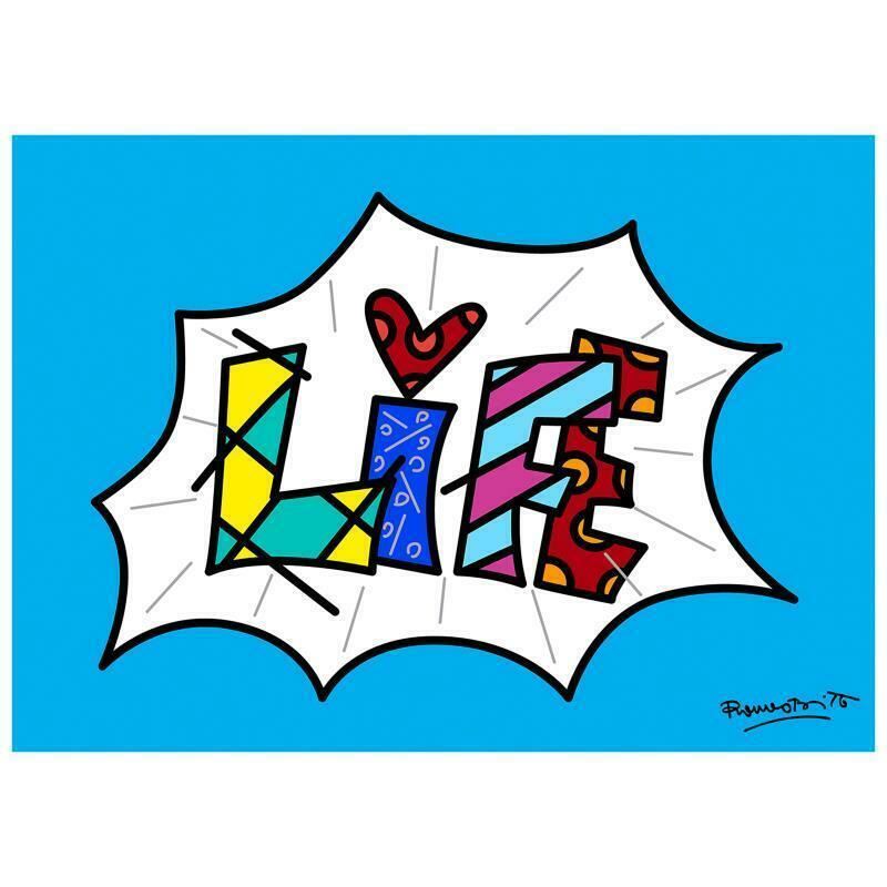 "Life Blue Mini Word" is an open edition giclee on canvas by Romero Britto. The piece comes hand signed by the artist and is authenticated en verso with the official Britto stamp. Measures approximately: 5" x 7".