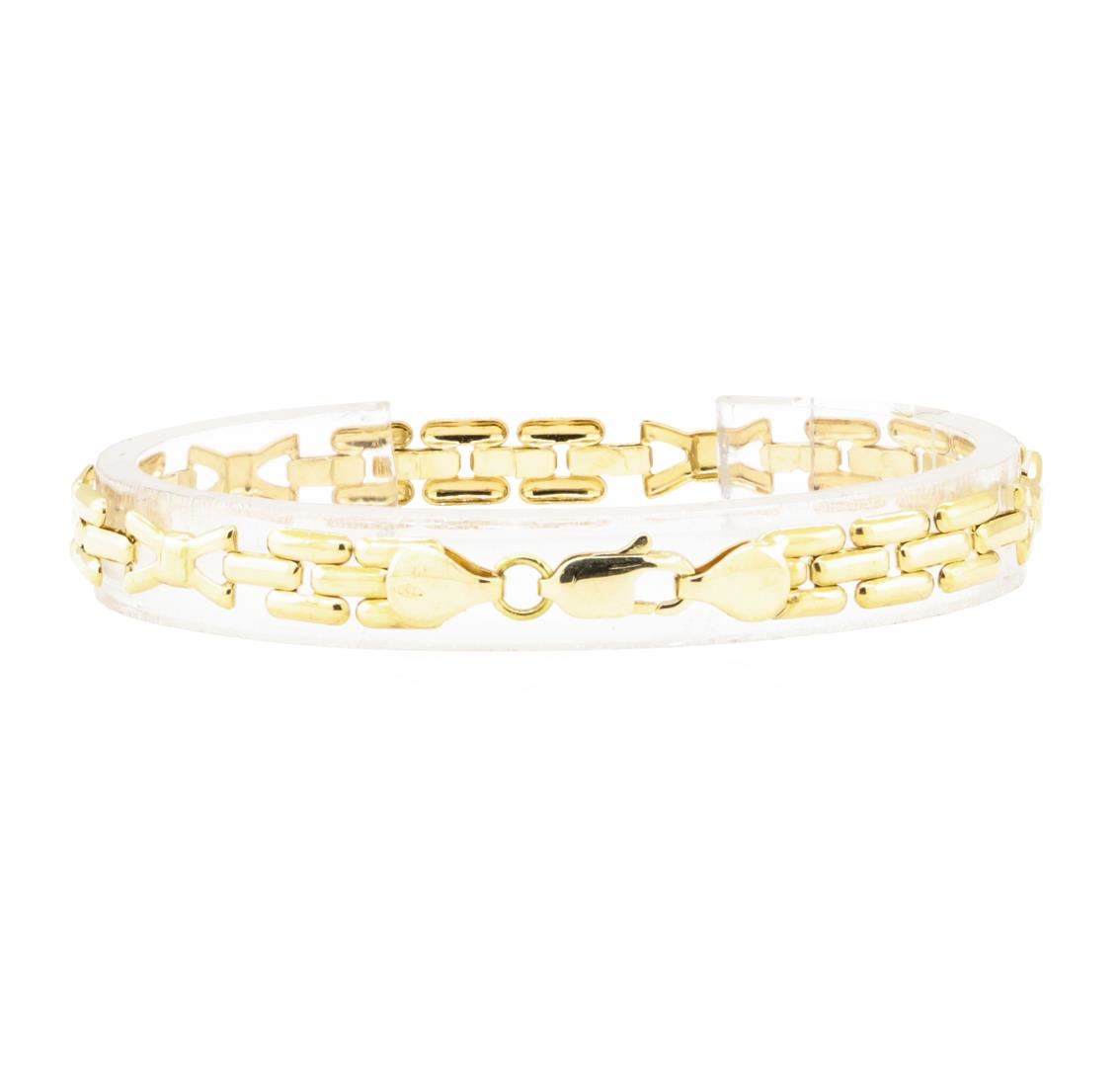 One link bracelet measuring approximately seven inches in length and 6.5mm in width featuring: 18KT yellow gold weighing 8.2 grams.