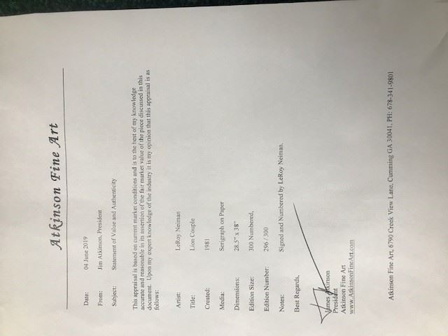 "Lion Couple" by LeRoy Neiman (1921-2012) - Hand signed limited edition serigraph #296 of 300 - Includes Certificate of Authenticity - Framed size = 54" wide x 44" tall