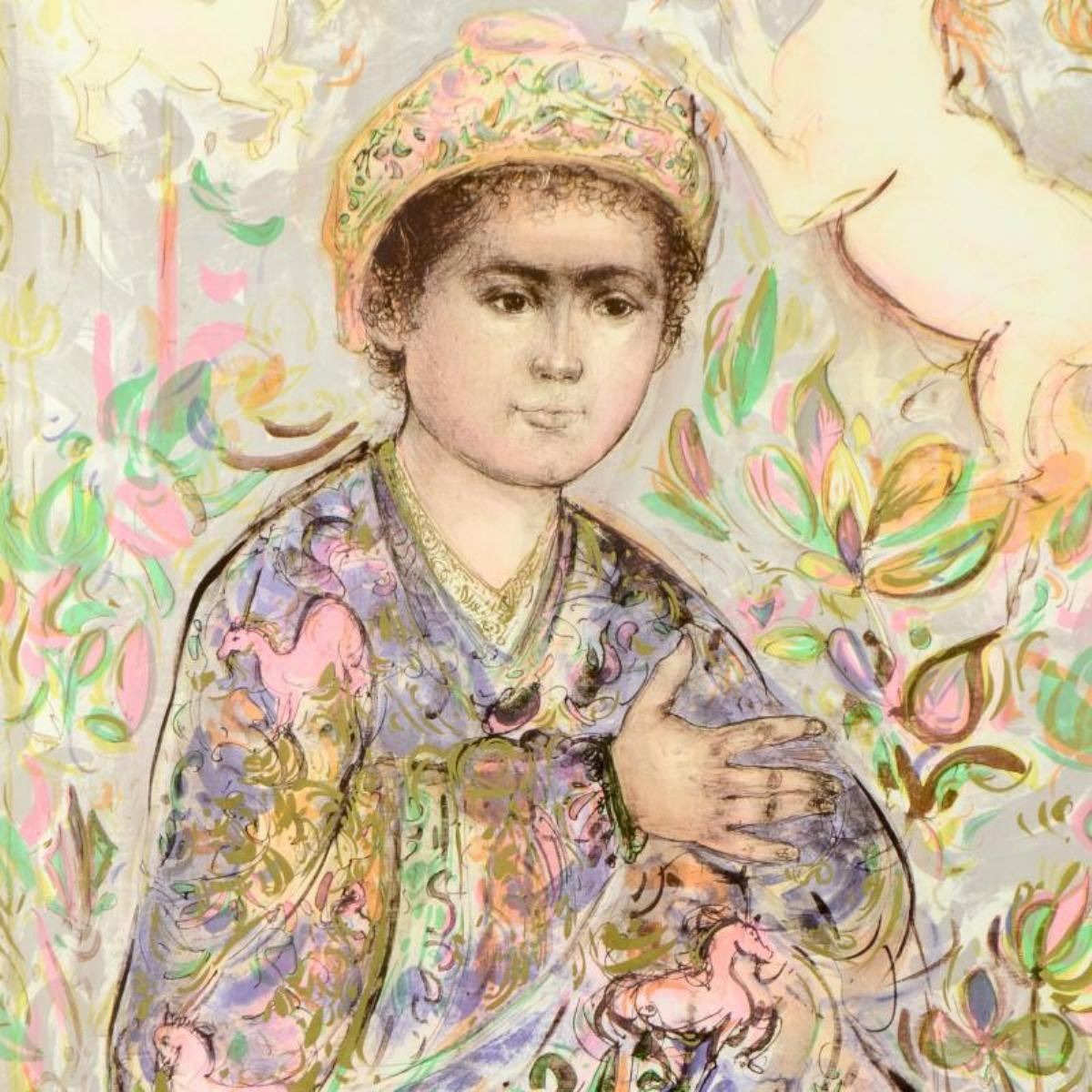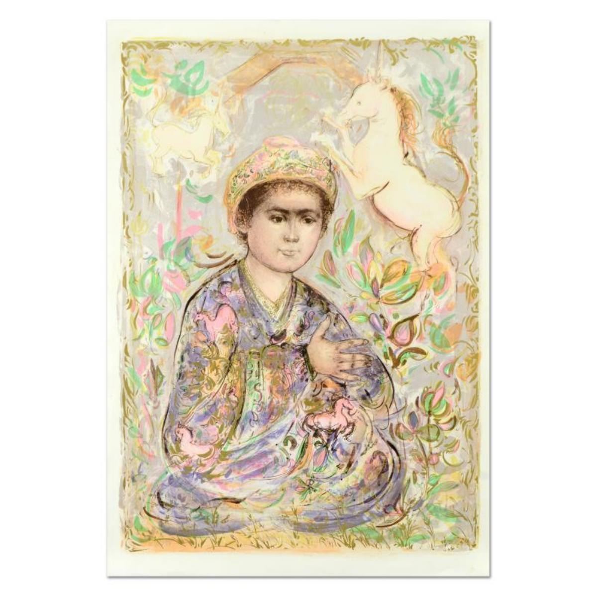 "Little Rajah and the Unicorns" is a limited edition lithograph on paper by Edna Hibel (1917-2014), numbered and hand signed by the artist. Includes Certificate of Authenticity. Measures approx. 31" x 45" (border), 29" x 41.5" (image). ** Please note: There are small tears and creases in the border area that may be concealed when framed. **