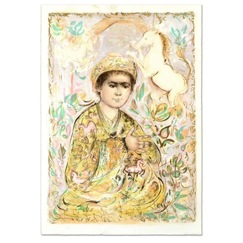 "Little Rajah and the Unicorns" is a limited edition lithograph on paper, numbered and hand signed by Edna Hibel (1917-2014). Includes Certificate of Authenticity! Measures approx. 31.5" x 45" (with border), 29.5" x 41.5" (image).