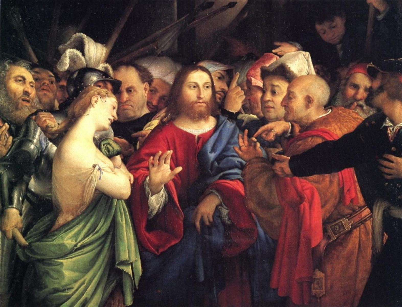 Artist: Lorenzo Lotto - Title: Christ and the Adulteress - Medium: Fine Art Giclee on Canvas - Image Size: Approximately 32 inches x 24.5 inches - Unframed on Unstretched Canvas - Biography: Lorenzo Lotto (c. 1480 - 1556/57) was an Italian painter, draughtsman and illustrator, traditionally placed in the Venetian school, though much of his career was spent in other north Italian cities. He painted mainly altarpieces, religious subjects and portraits. He was active during the High Renaissance and the first half of the Mannerist period, but his work maintained a generally similar High Renaissance style throughout his career, although his nervous and eccentric posings and distortions represented a transitional stage to the Florentine and Roman Mannerists.