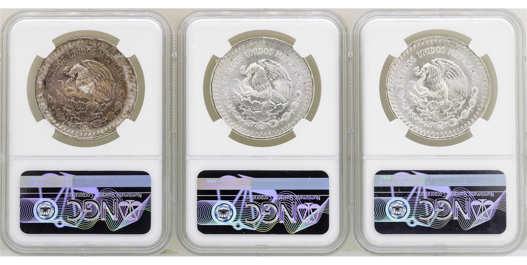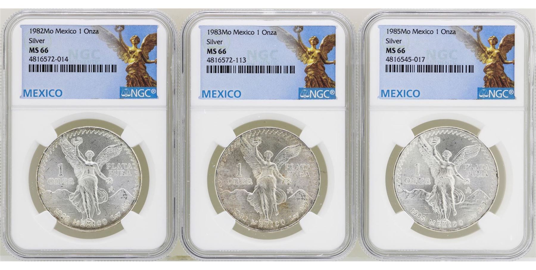 One Lot of 1982Mo/1983Mo/1985Mo Mexico Libertad Onza Silver Coins NGC MS66. NGC Certified.