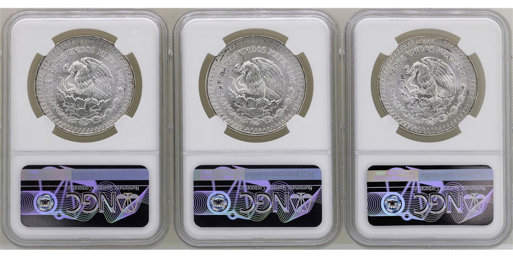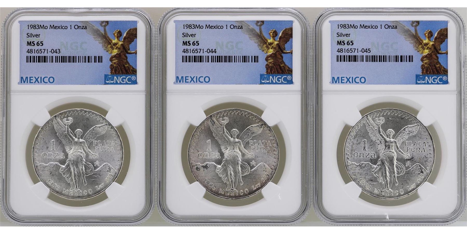 One Lot of (3) 1983Mo Mexico Libertad Onza Silver Coins NGC MS65. NGC Certified.