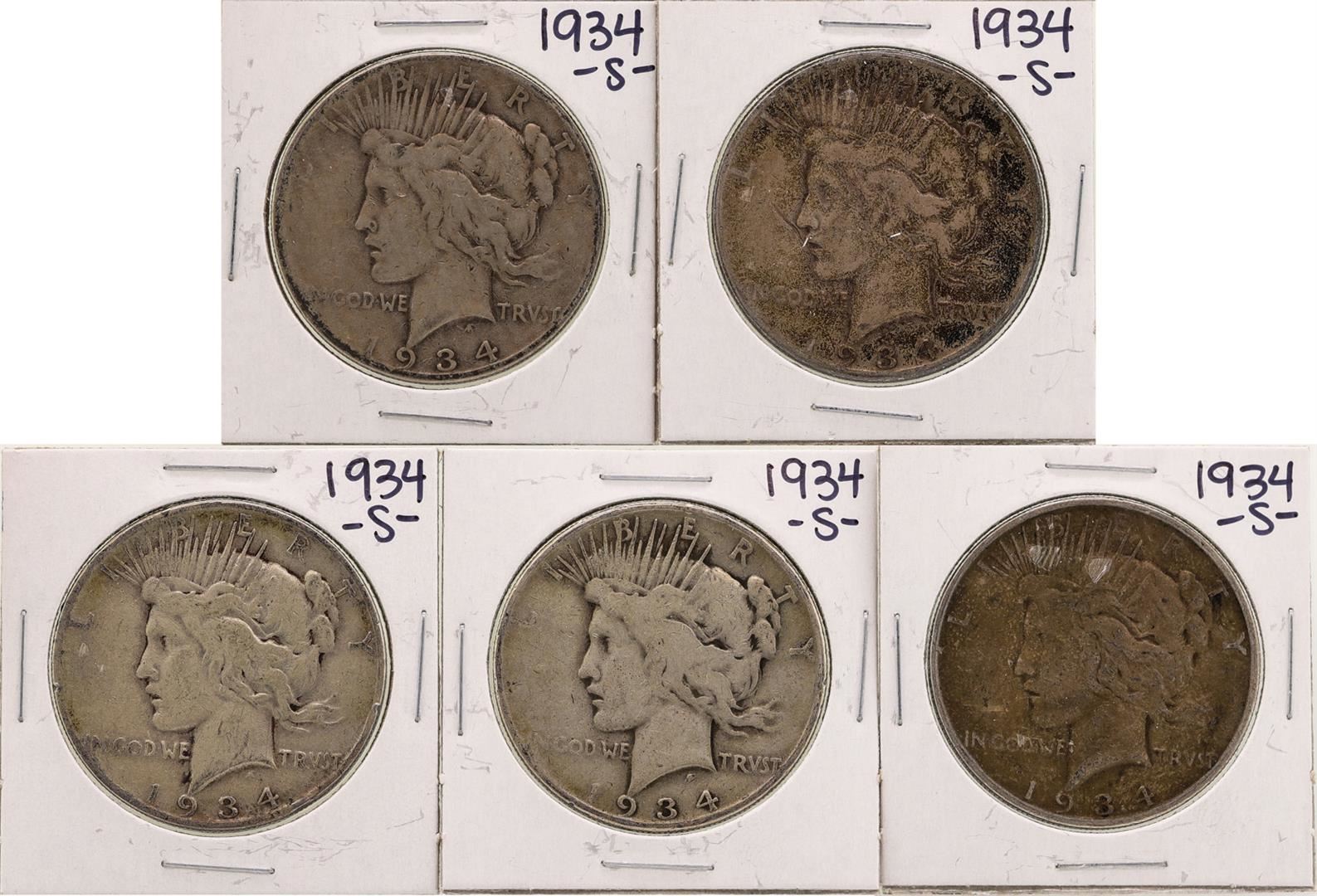 One Lot of (5) 1934-S $1 Peace Silver Dollar Coins.