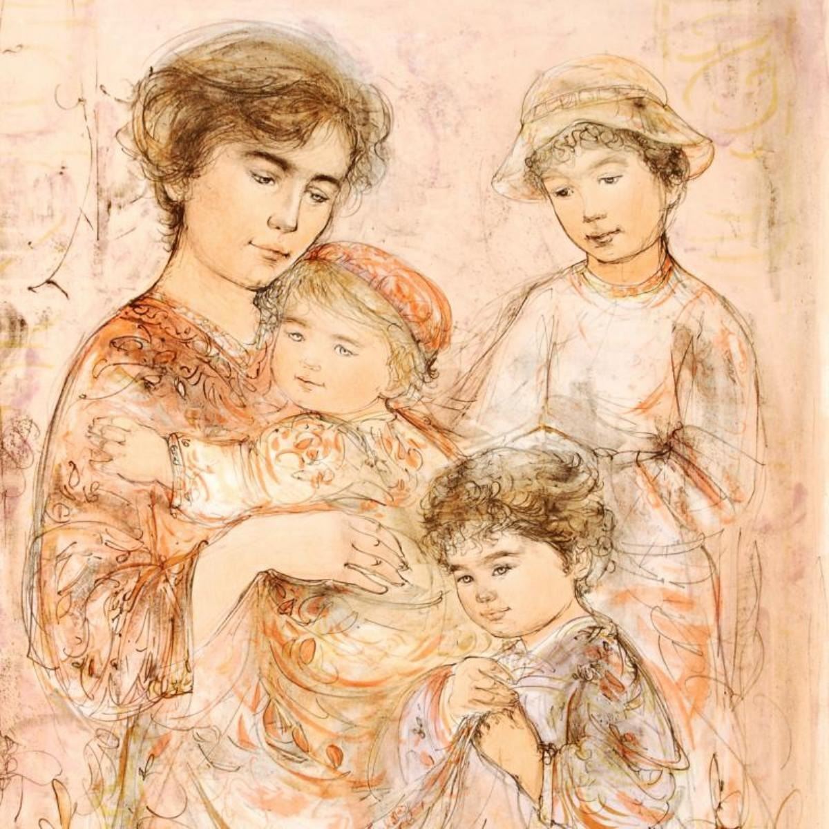 "Lotte and Her Children" is a limited edition lithograph on paper, numbered and hand signed by Edna Hibel (1917-2014). Includes Certificate of Authenticity! Measures approx. 30" x 42" (with border), 27" x 37.5" (image).