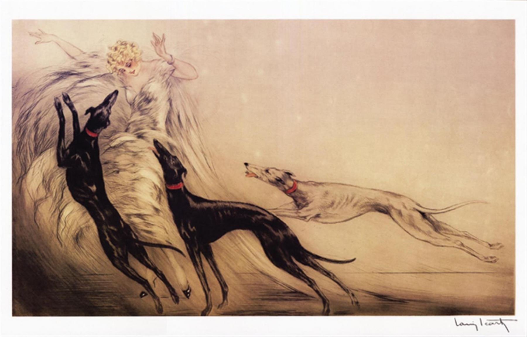 Artist: Louis Icart Title: La Femme & Les Chiens Medium: Fine Art Reproduction Giclee on Canvas Image Size: Approximately 12.5 inches x 20 inches Unframed on Unstretched Canvas Biography: Louis Icart was born in Toulouse, France. In Icart's drawings, one sees the Impressionists Degas and Monet and, in his rare watercolors, the Symbolists Odilon Redon and Gustave Moreau. In fact, Icart lived outside the fashionable artistic movements of the time and was not completely sympathetic to contemporary art. Nonetheless, his Parisian scenes are a documentation of the life he saw around him and they are nearly as popular today as when they were first produced.