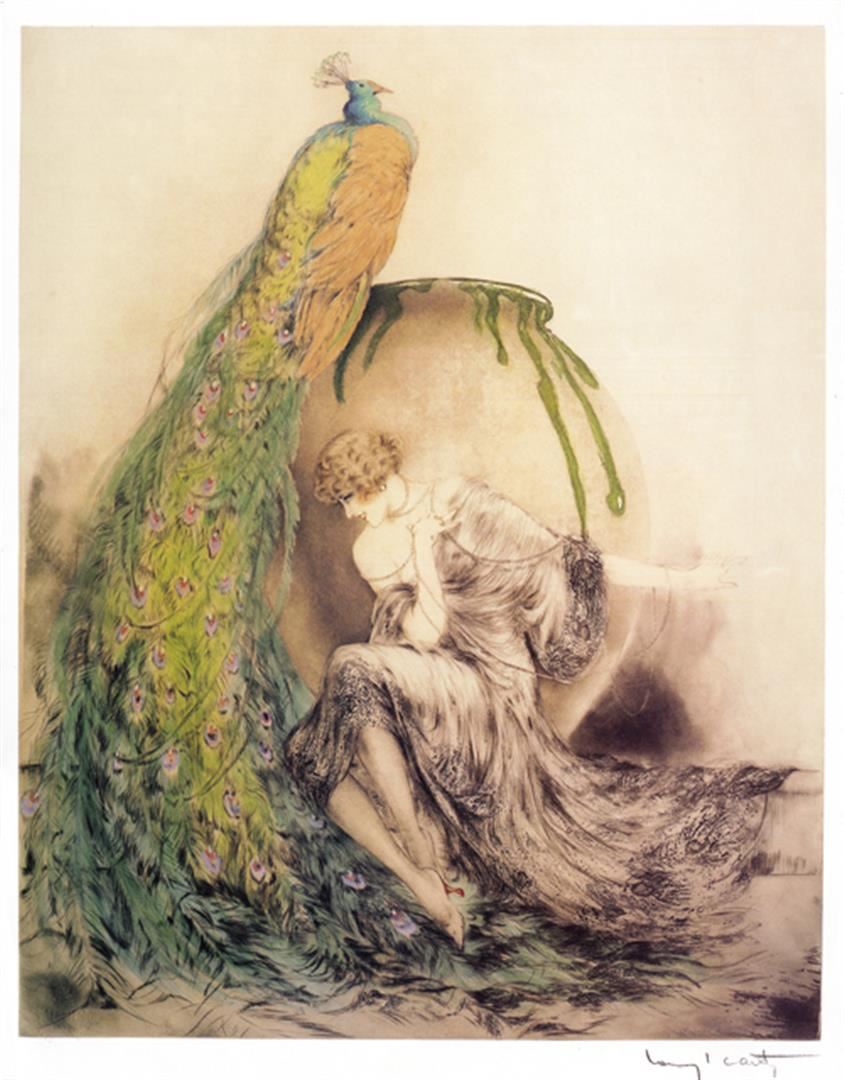 Artist: Louis Icart Title: Peacock Medium: Fine Art Reproduction Giclee on Canvas Image Size: Approximately 25.5 inches x 20 inches Unframed on Unstretched Canvas Biography: Louis Icart was born in Toulouse, France. In Icart's drawings, one sees the Impressionists Degas and Monet and, in his rare watercolors, the Symbolists Odilon Redon and Gustave Moreau. In fact, Icart lived outside the fashionable artistic movements of the time and was not completely sympathetic to contemporary art. Nonetheless, his Parisian scenes are a documentation of the life he saw around him and they are nearly as popular today as when they were first produced.
