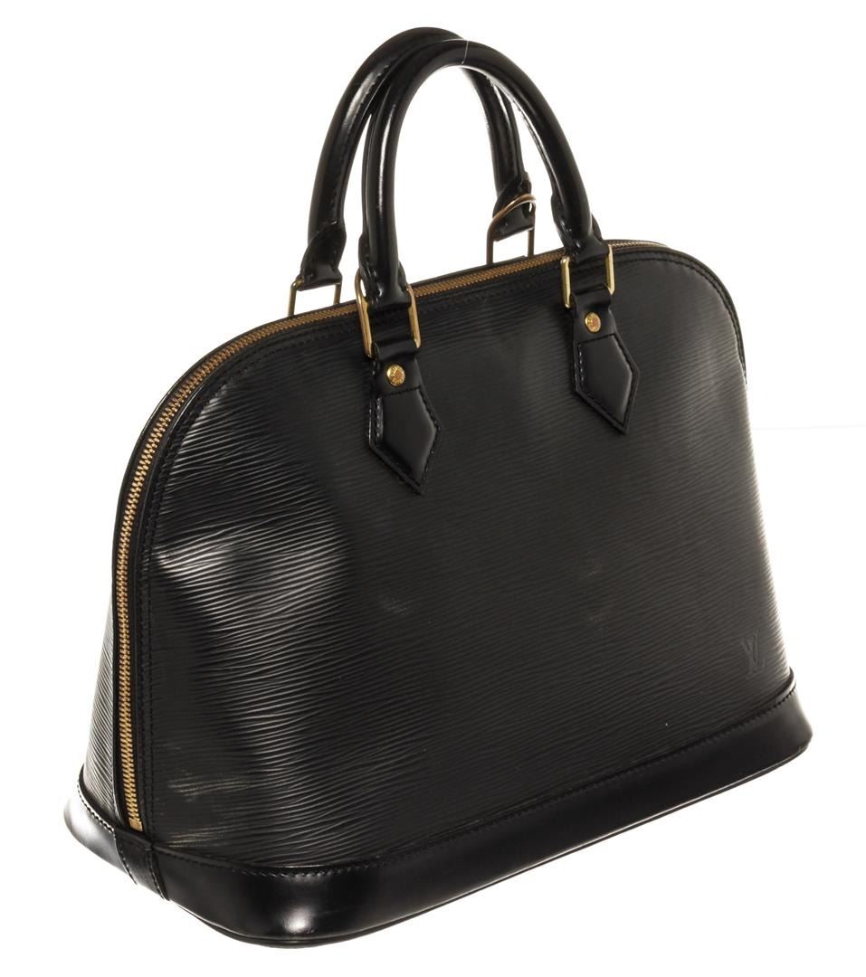 One Louis Vuitton Alma GM. Item is sold AS-IS. All available information is listed in the description and shown in the photo. Louis Vuitton Alma GM Black Epi Leather. Features gold hardware, black canvas interior, black leather handles, and a gold zipper closure.