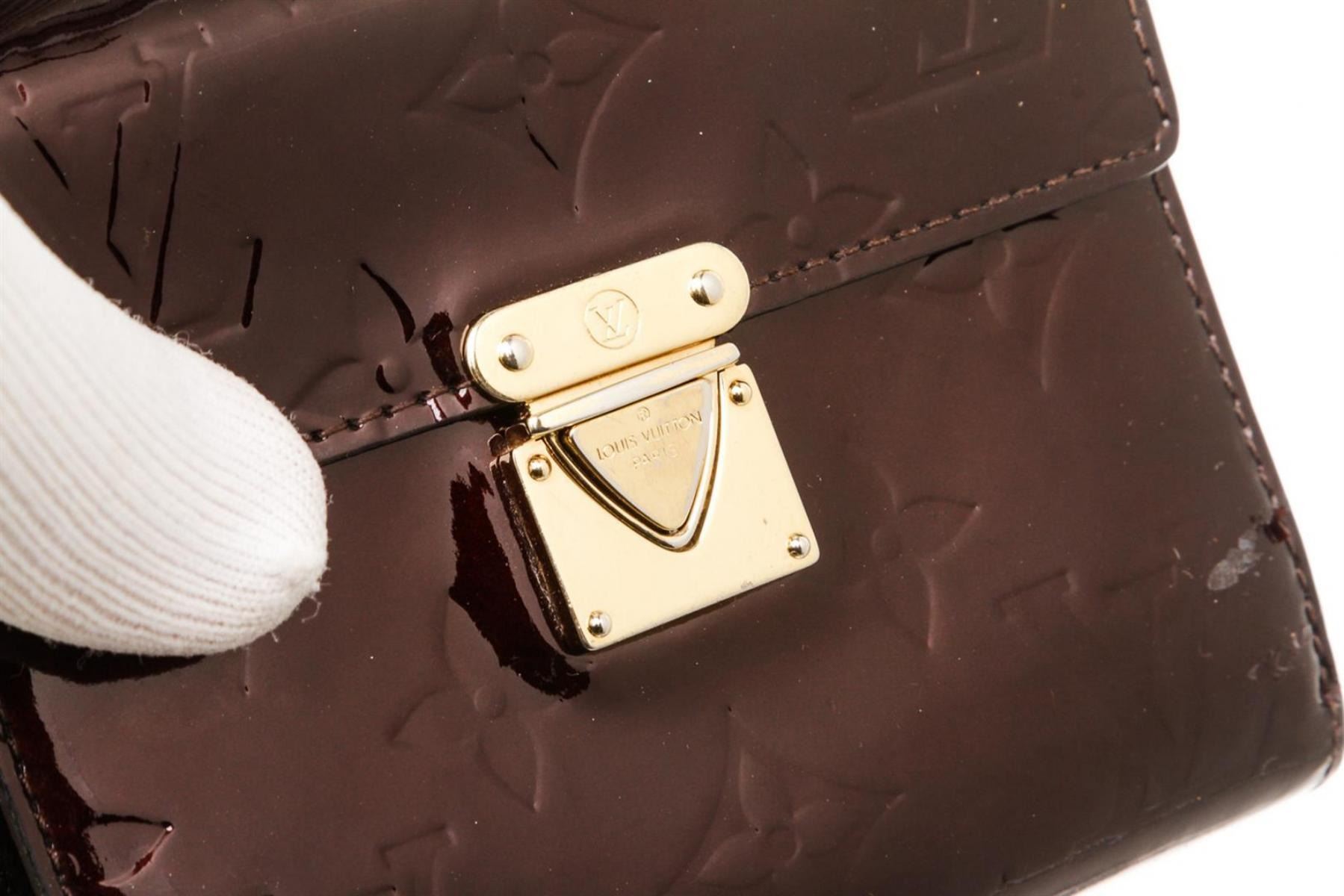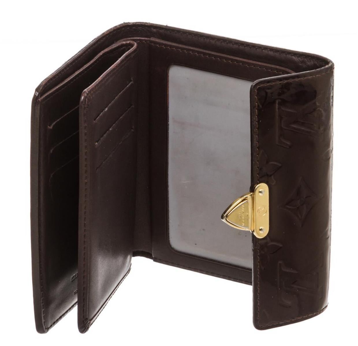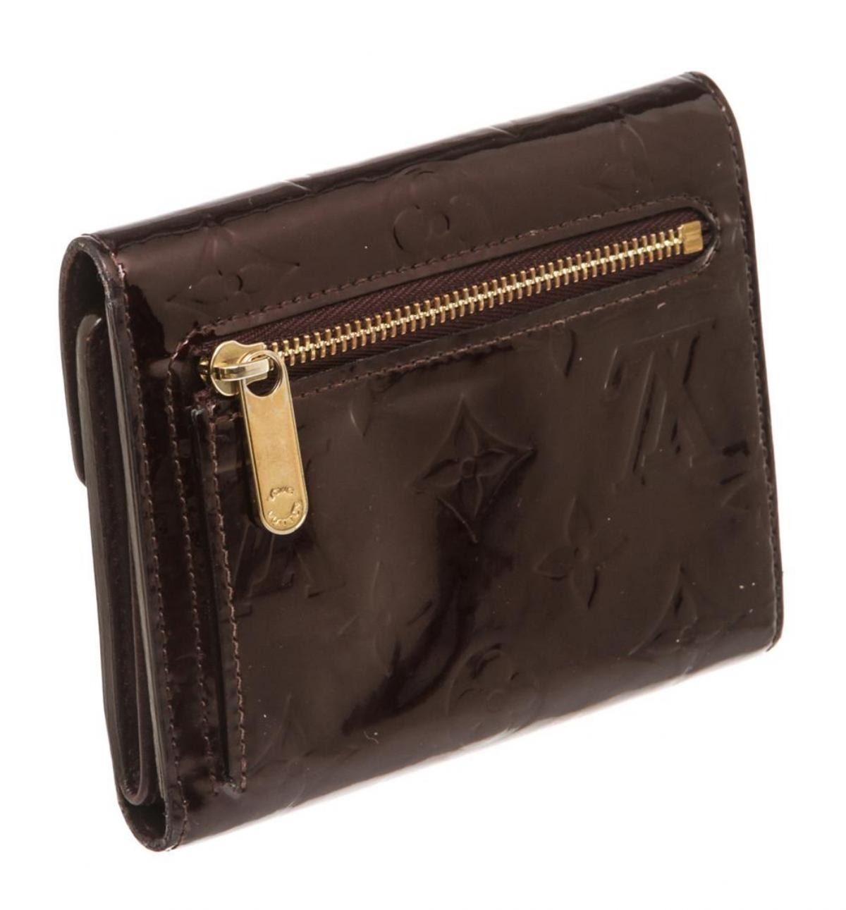 Amarante Vernis leather Louis Vuitton Koala wallet with brass hardware, single exterior zip coin compartment, tonal leather interior, single interior bill compartment, 10 interior card slots and push-lock closure at front flap.