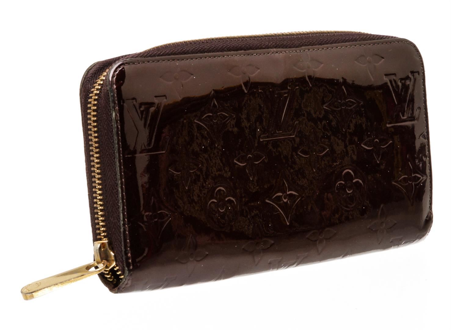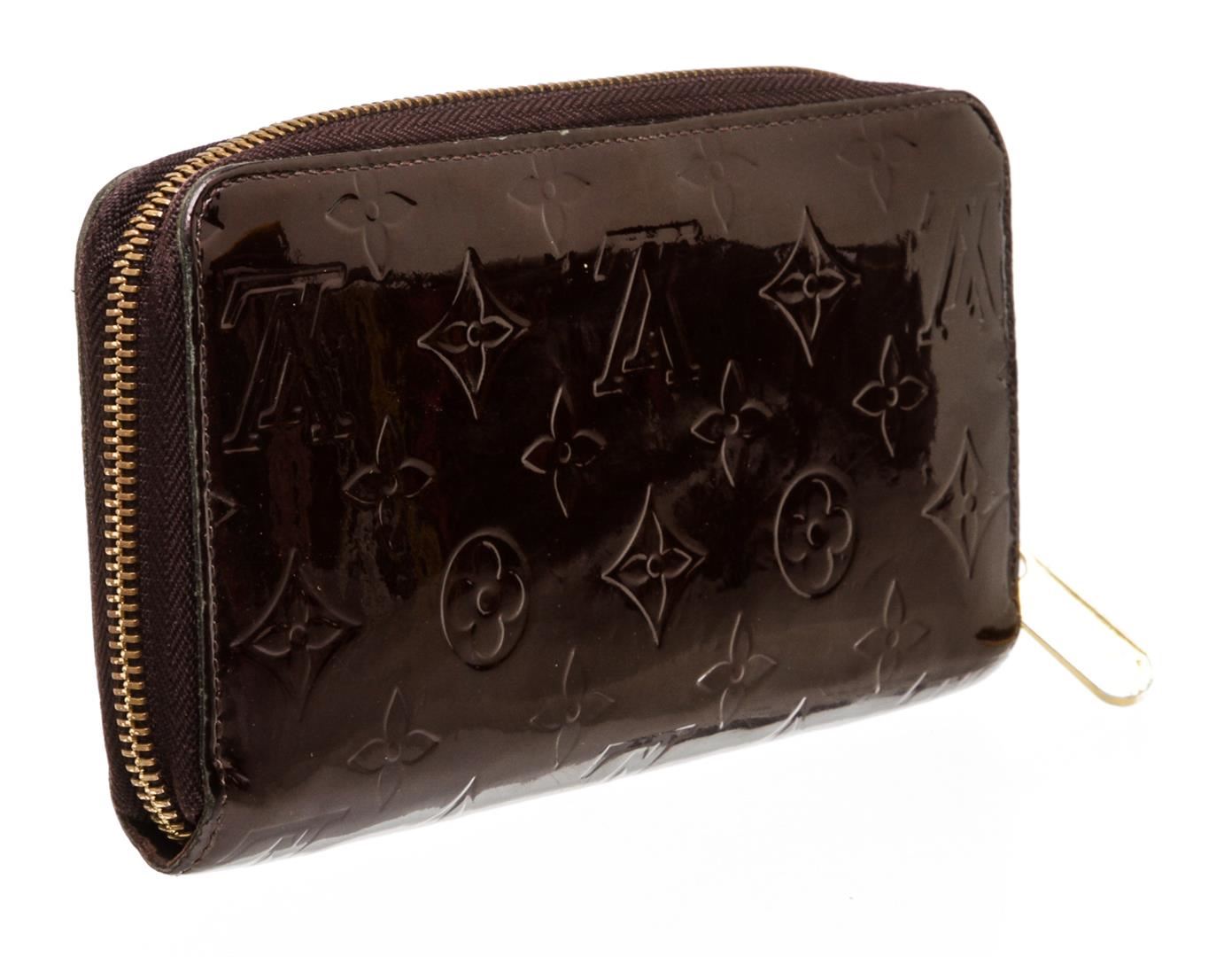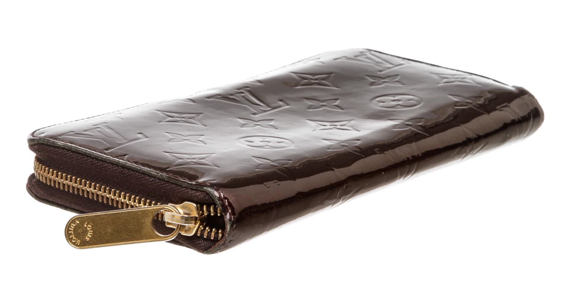 One Louis Vuitton Amarante Vernis Monogram Zippy Wallet. Monogram Vernis leather Louis Vuitton Zippy wallet with brass hardware, tonal leather lining, four interior compartments; one with zip closure, three bill compartments, eight card slots and zip-around closure.