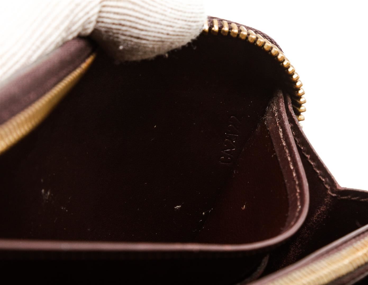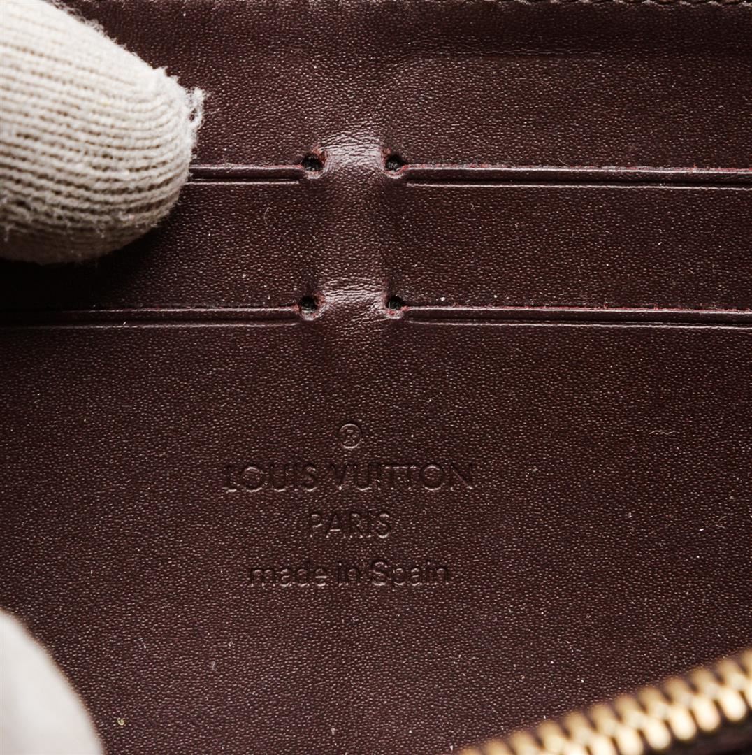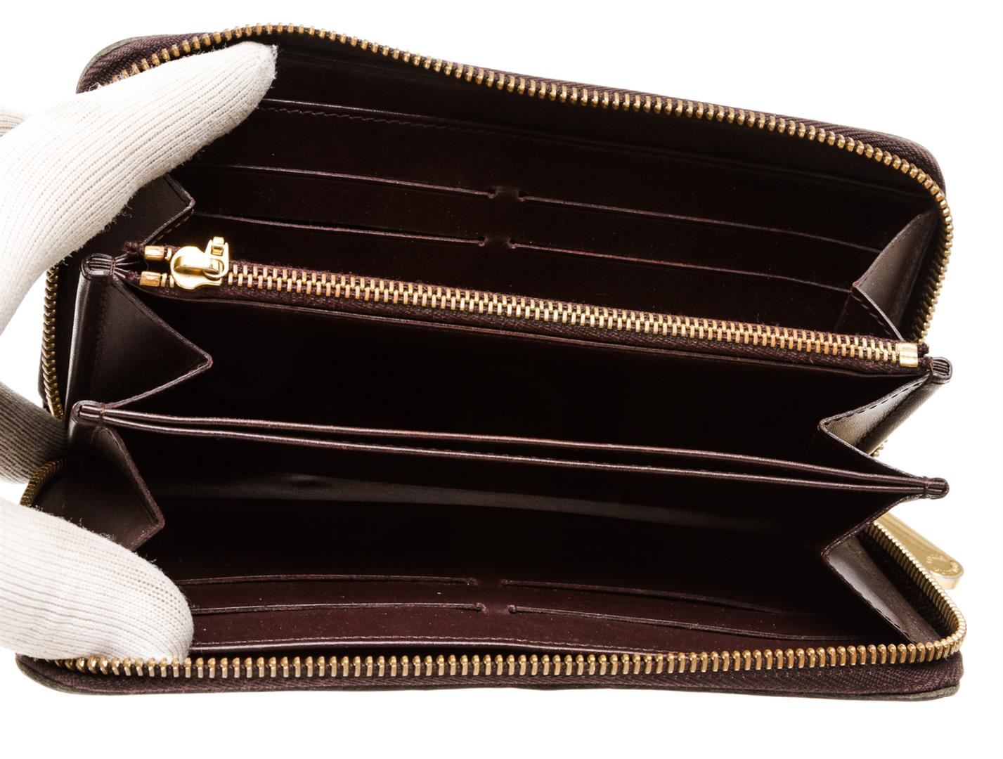 One Louis Vuitton Amarante Vernis Monogram Zippy Wallet. Monogram Vernis leather Louis Vuitton Zippy wallet with brass hardware, tonal leather lining, four interior compartments; one with zip closure, three bill compartments, eight card slots and zip-around closure.
