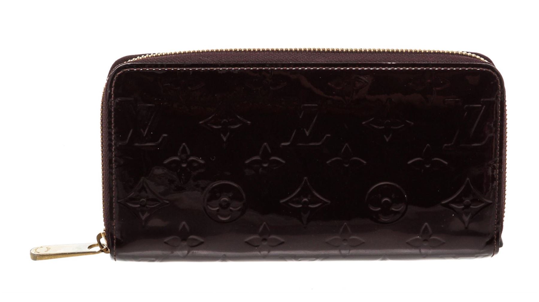 Amarante Monogram Vernis leather Louis Vuitton Zippy wallet with brass hardware, tonal leather lining, four interior compartments; one with zip closure, three bill compartments, eight card slots and zip-around closure.