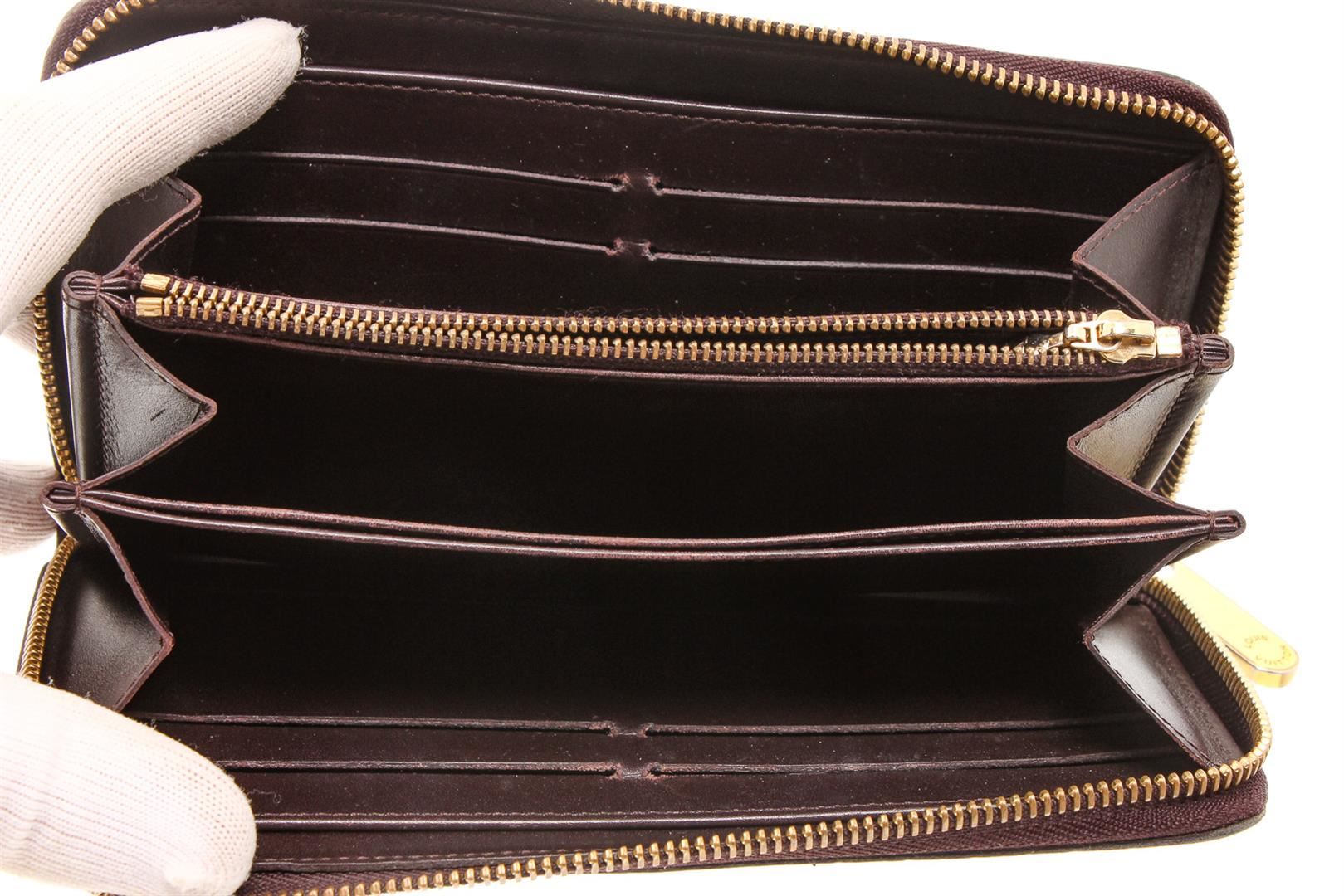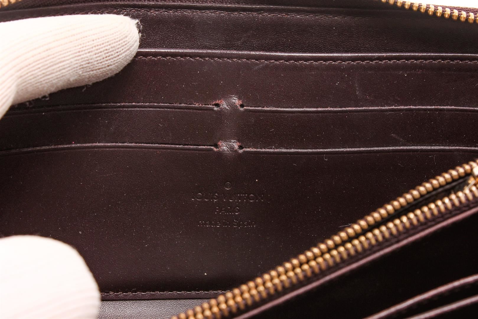 Amarante Monogram Vernis leather Louis Vuitton Zippy wallet with brass hardware, tonal leather lining, four interior compartments; one with zip closure, three bill compartments, eight card slots and zip-around closure.