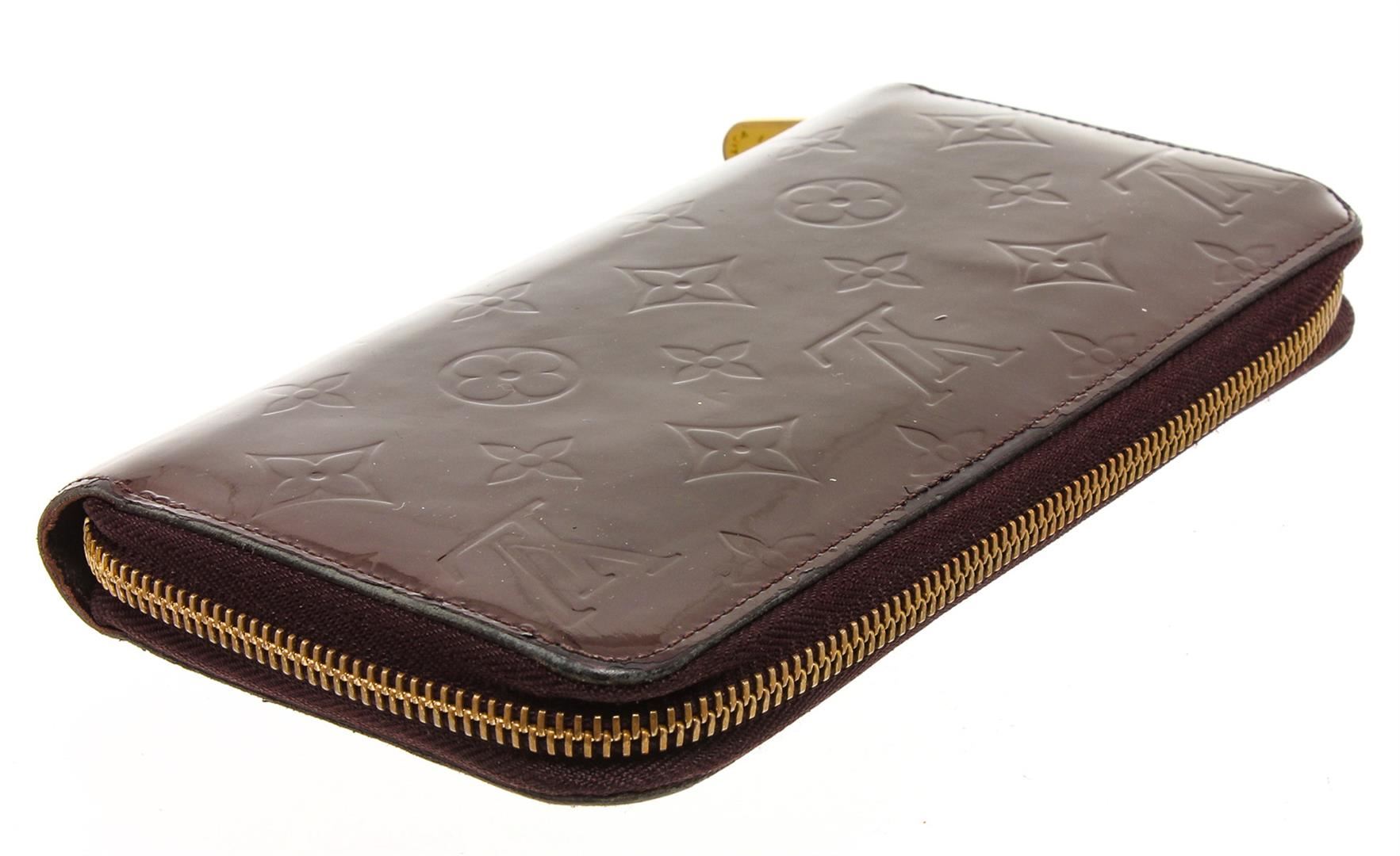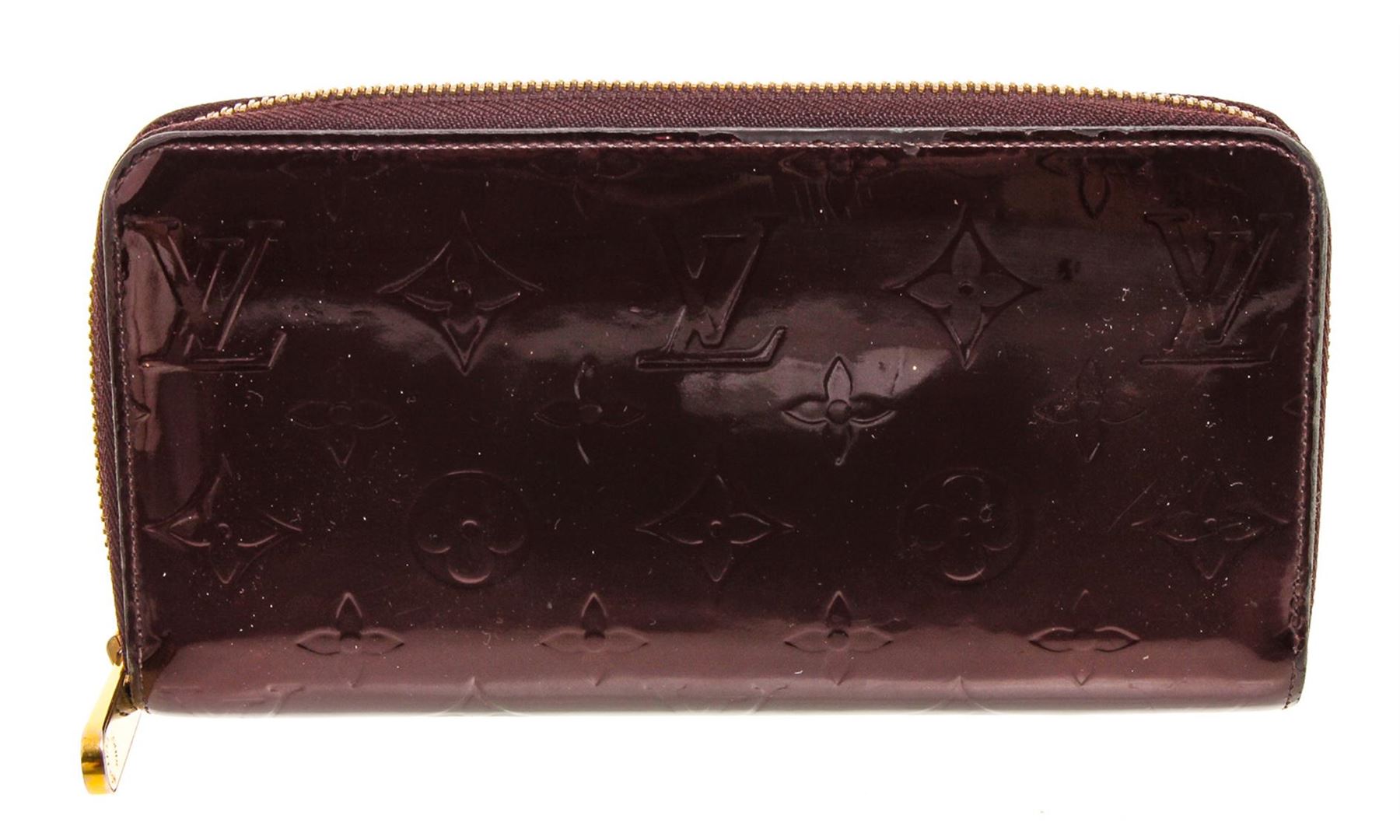 Amarante Monogram Vernis leather Louis Vuitton Zippy wallet with brass hardware, tonal leather lining, four interior compartments; one with zip closure, three bill compartments, eight card slots and zip-around closure.