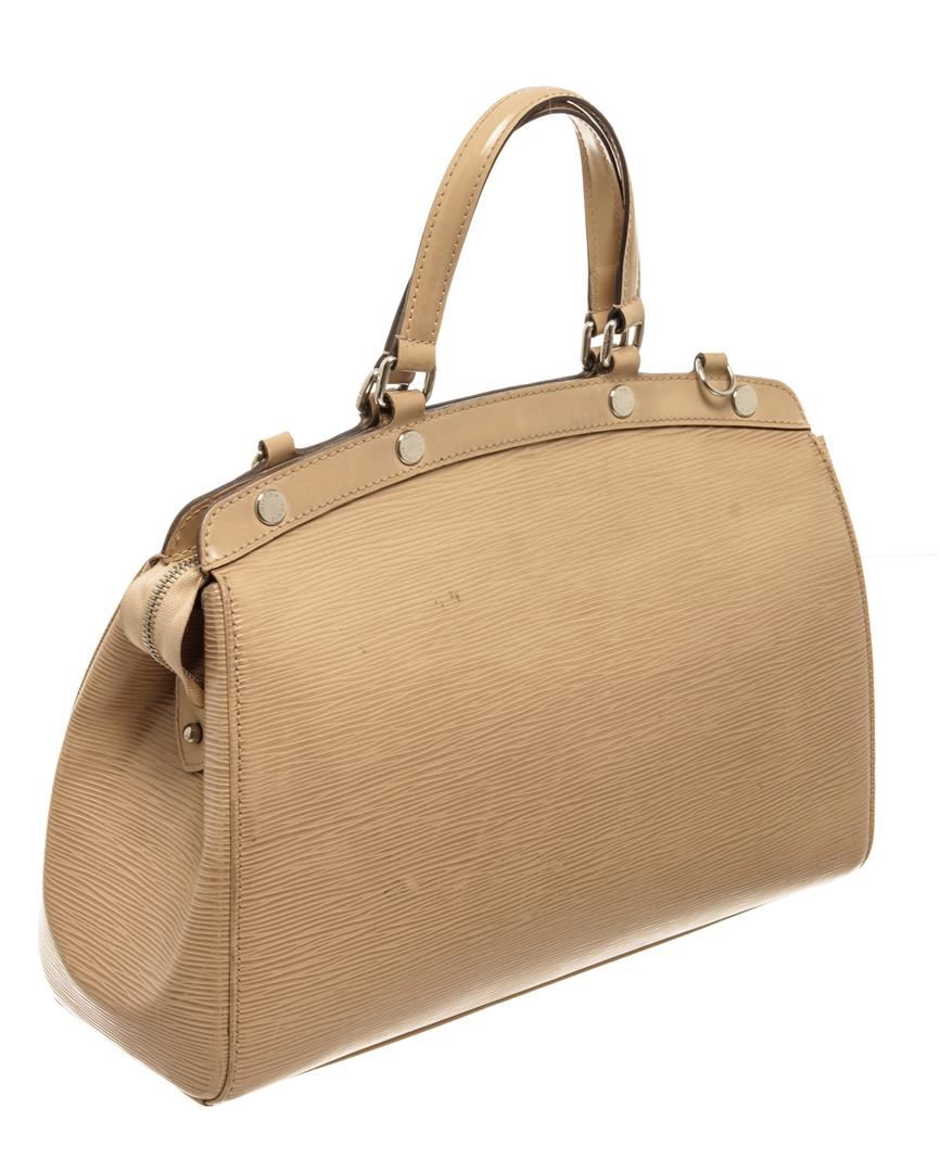 One Louis Vuitton Beige Epi Leather Brea MM Satchel Shoulder Bag. Item is sold AS-IS. All available information is listed in the description and shown in the photo. Beige Epi leather Louis Vuitton Brea MM bag with silver tone hardware, leather trim, brown canvas lining, three interior pockets (one with zipper closure, 2 slip pockets), embossed LV logo on front bottom corner, dual flat leather handles, detachable adjustable leather strap, and top zipper closure. .
