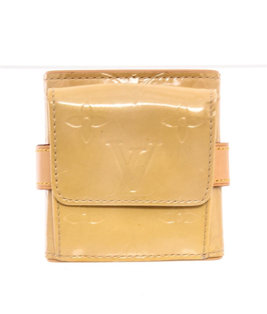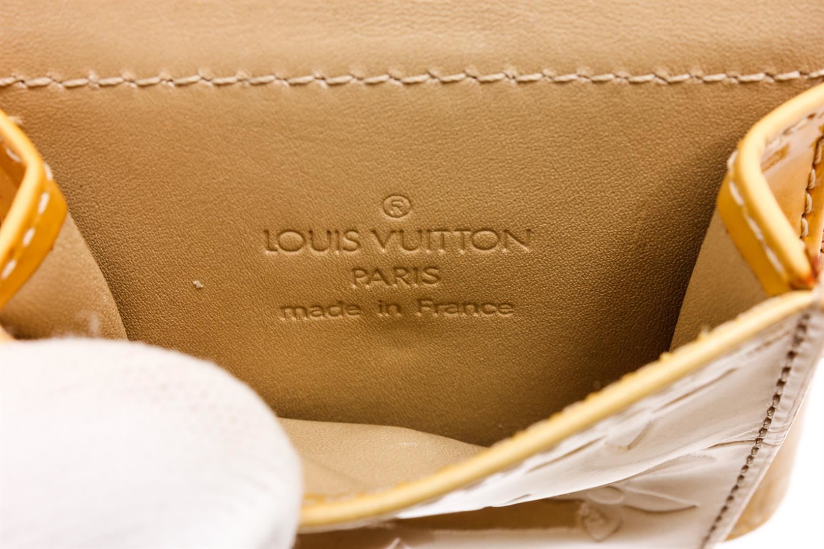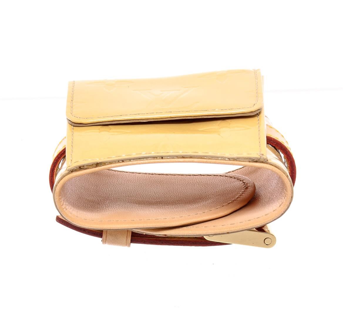 Beige embossed patent leather Louis Vuitton Vernis Lafayette Street coin purse bracelet with gold-tone hardware, tan leather trim, single flap pocket at front and buckle closure.