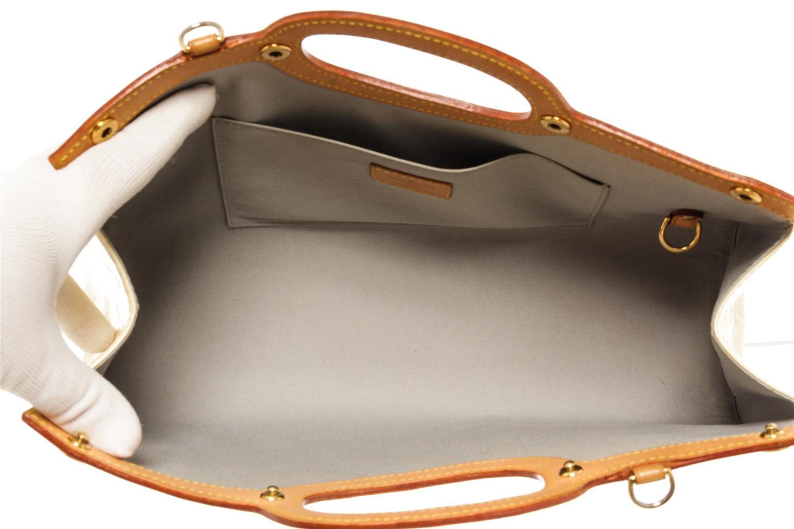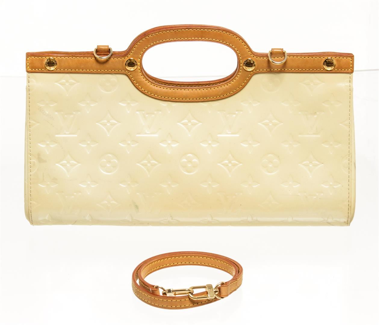 Louis Vuitton Beige Vernis Leather Roxbury Drive Handbag. All available information is listed in the description and shown in the photos. Louis Vuitton Beige Vernis Leather Roxbury Drive Handbag with gold tone hardware, tan leather trim, gray fabric lining, interior open pocket, and snap closure.