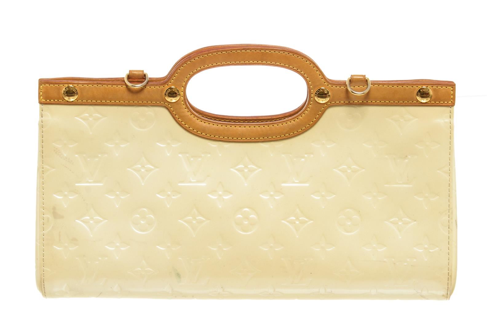 Louis Vuitton Beige Vernis Leather Roxbury Drive Handbag. All available information is listed in the description and shown in the photos. Louis Vuitton Beige Vernis Leather Roxbury Drive Handbag with gold tone hardware, tan leather trim, gray fabric lining, interior open pocket, and snap closure.