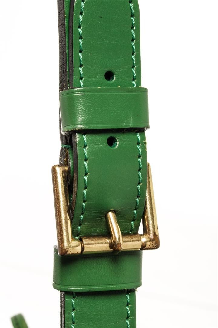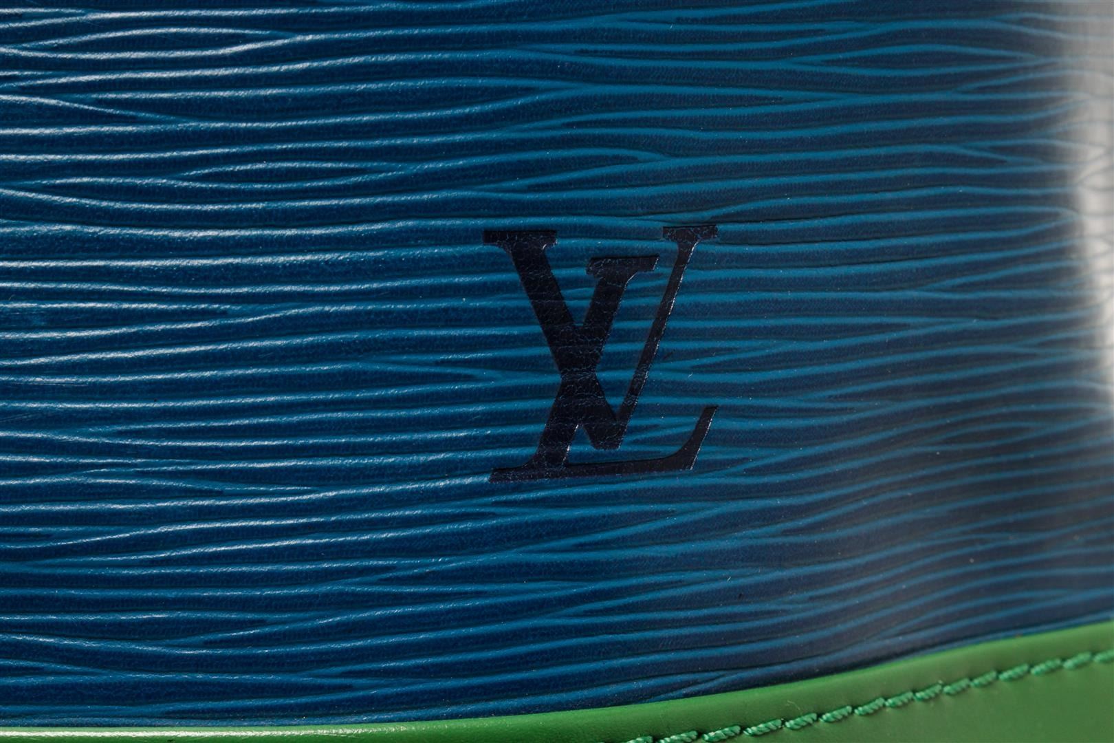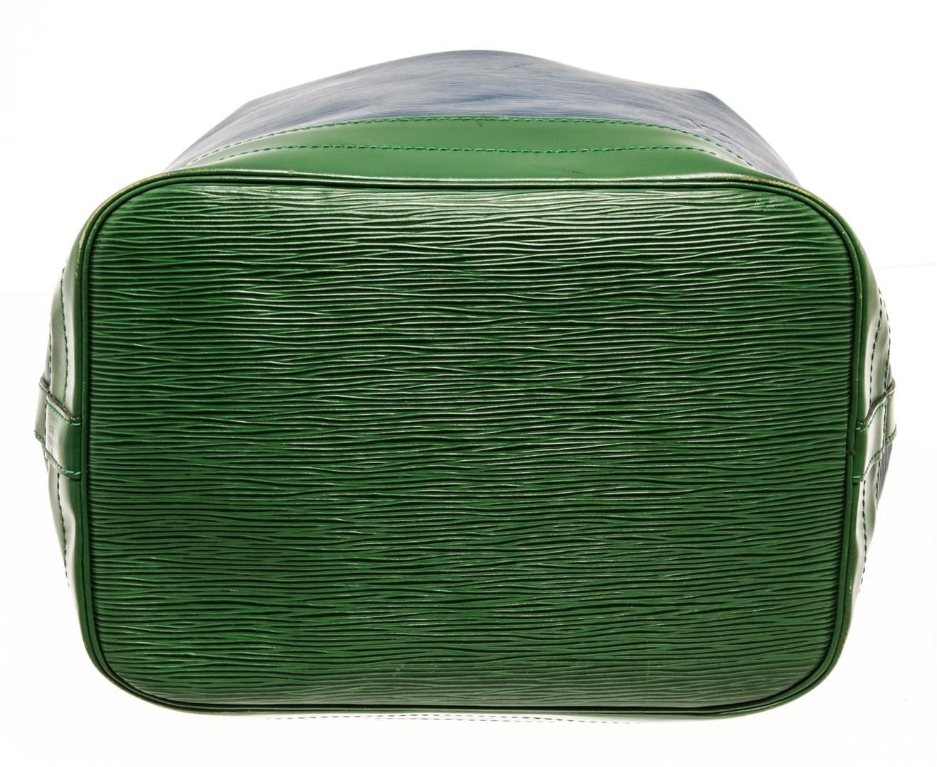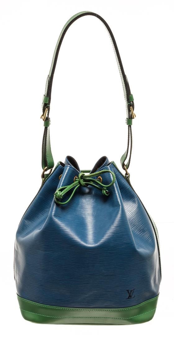 One Louis Vuitton Bi-Colored Epi Leather Noe Shoulder Bag. Item is sold AS-IS. All available information is listed in the description and shown in the photo. Louis Vuitton bi-colored epi leather Noe shoulder bag with blue epi leather exterior with green epi leather adjustable shoulder strap and trims, blue suede lining, gold-tone hardware, drawstring closure, and one main compartment.