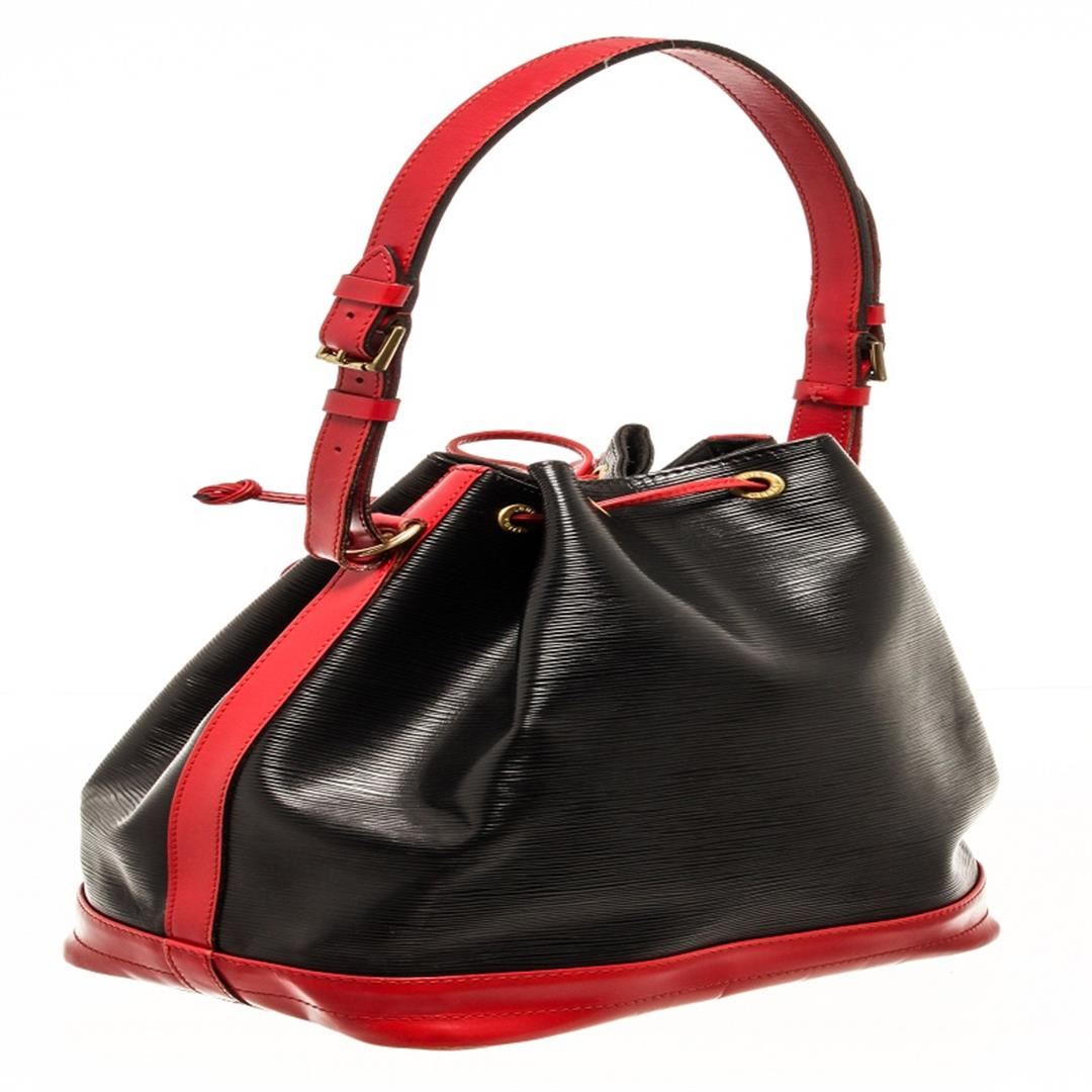 One Louis Vuitton Black And Red Epi Leather Noe Shoulder Bag. Item is sold AS-IS. All available information is listed in the description and shown in the photo. Louis Vuitton black and red epi leather Noe shoulder bag with this vintage 1991 features a bicolor epi leather body, an adjustable shoulder strap, and a top red leather drawstring closure and interior zipper pocket. such a great color combination bag from the 90s. The leather strap is peeling, the leather is cracking on the strap and hardware is tarnished as shown in pictures. Height: 10.23" Width: 13.38" Depth: 7.08", Shoulder Drop: 20.07" / 26 x 34 x 18 Cm