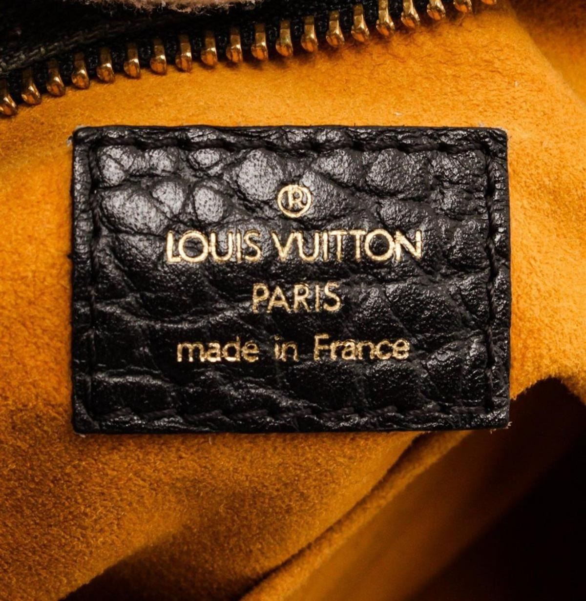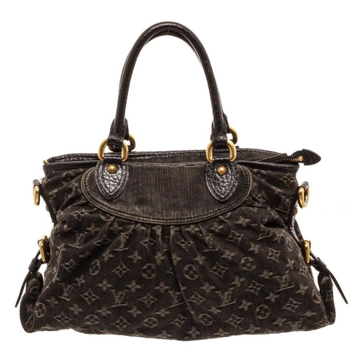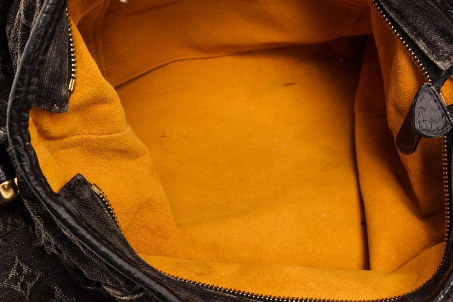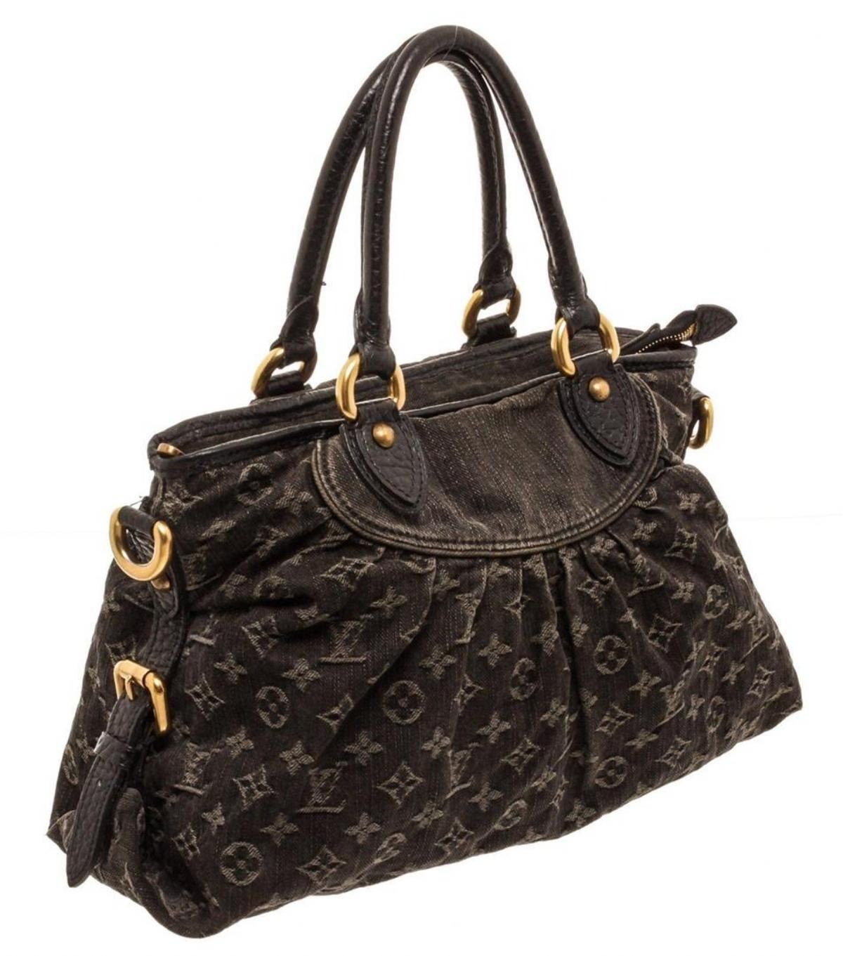 Black monogram denim Louis Vuitton Denim Neo Cabby MM with brass hardware, dual rolled top handles, detachable flat shoulder strap with buckle adjustment, tonal leather trim, marigold Alcantara lining, dual slip pockets at interior wall and zip closure at top.