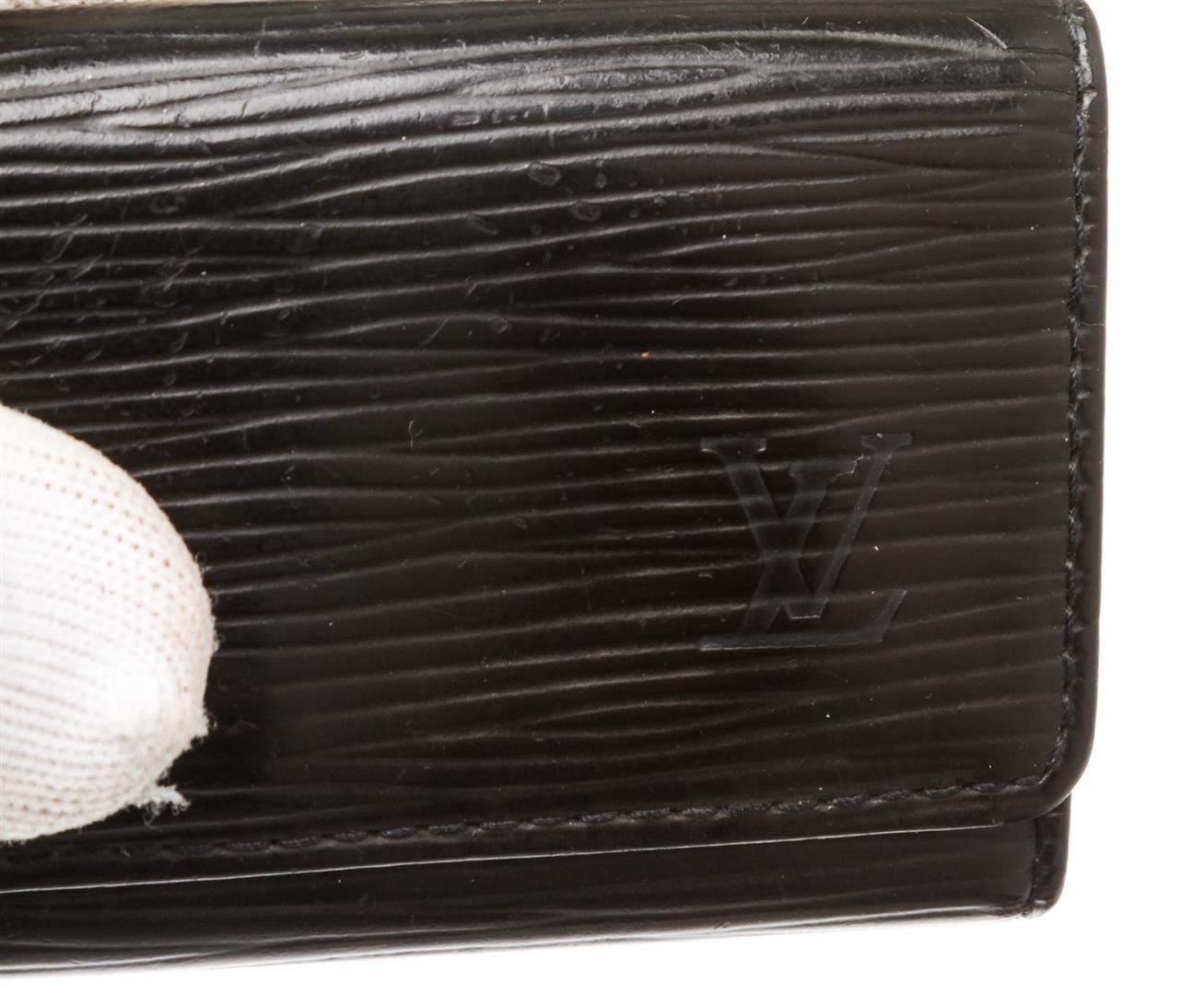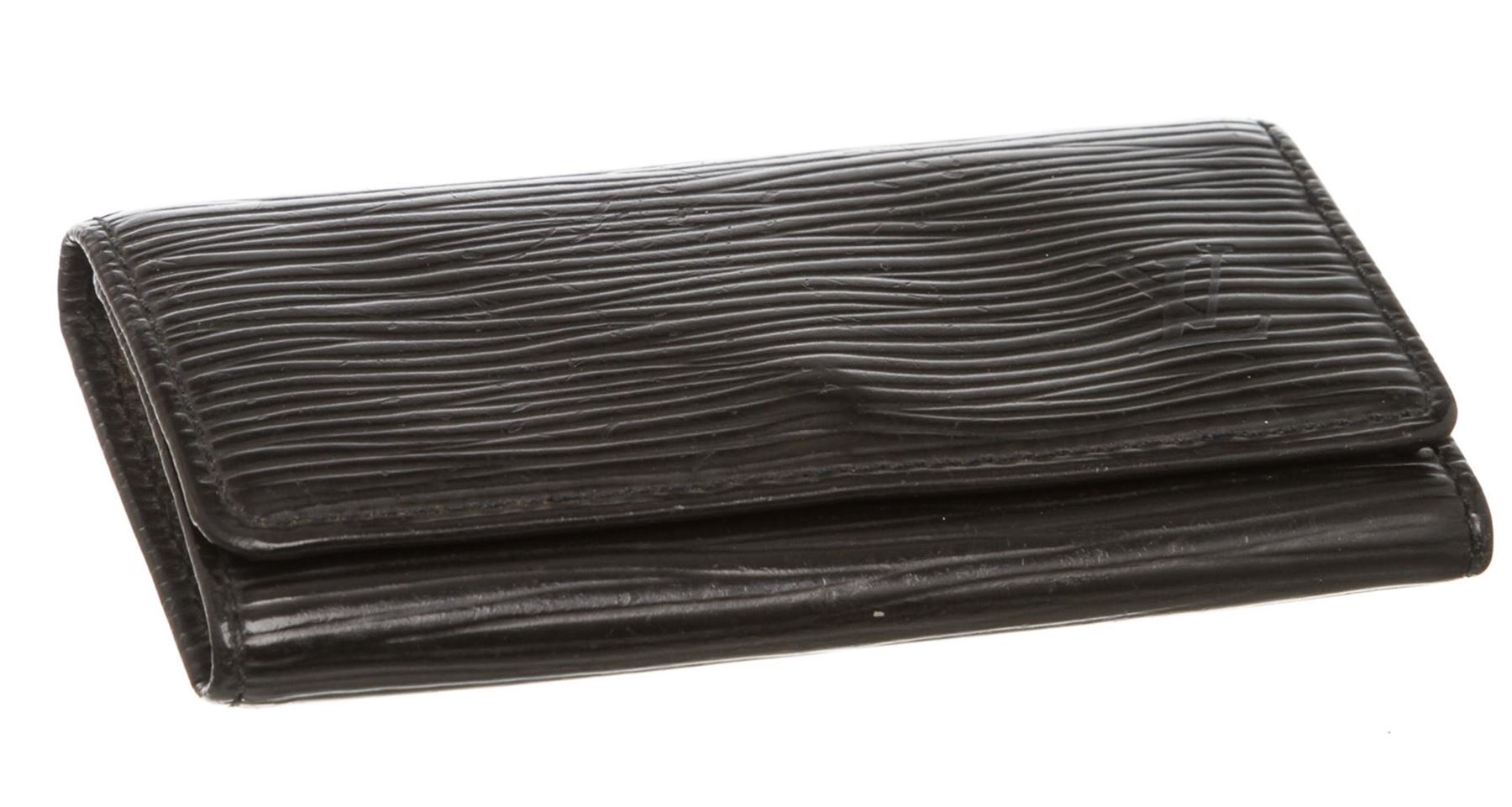 Epi leather Louis Vuitton 4 key holder with gold-tone hardware, debossed logo at front, tonal leather interior, four key clasps and snap closure at front flap.