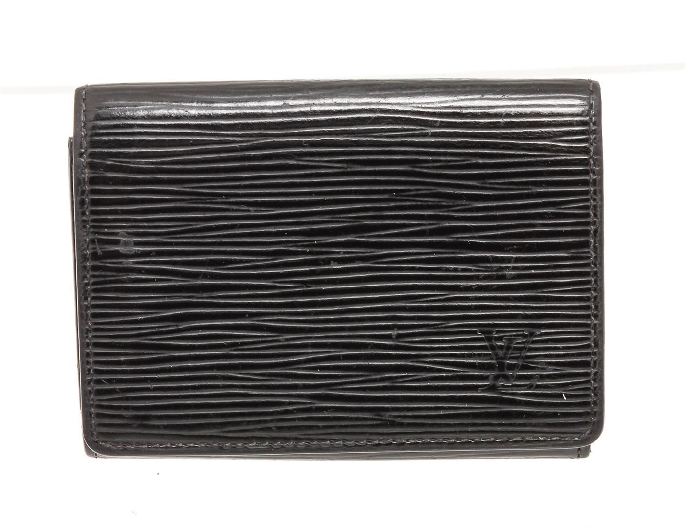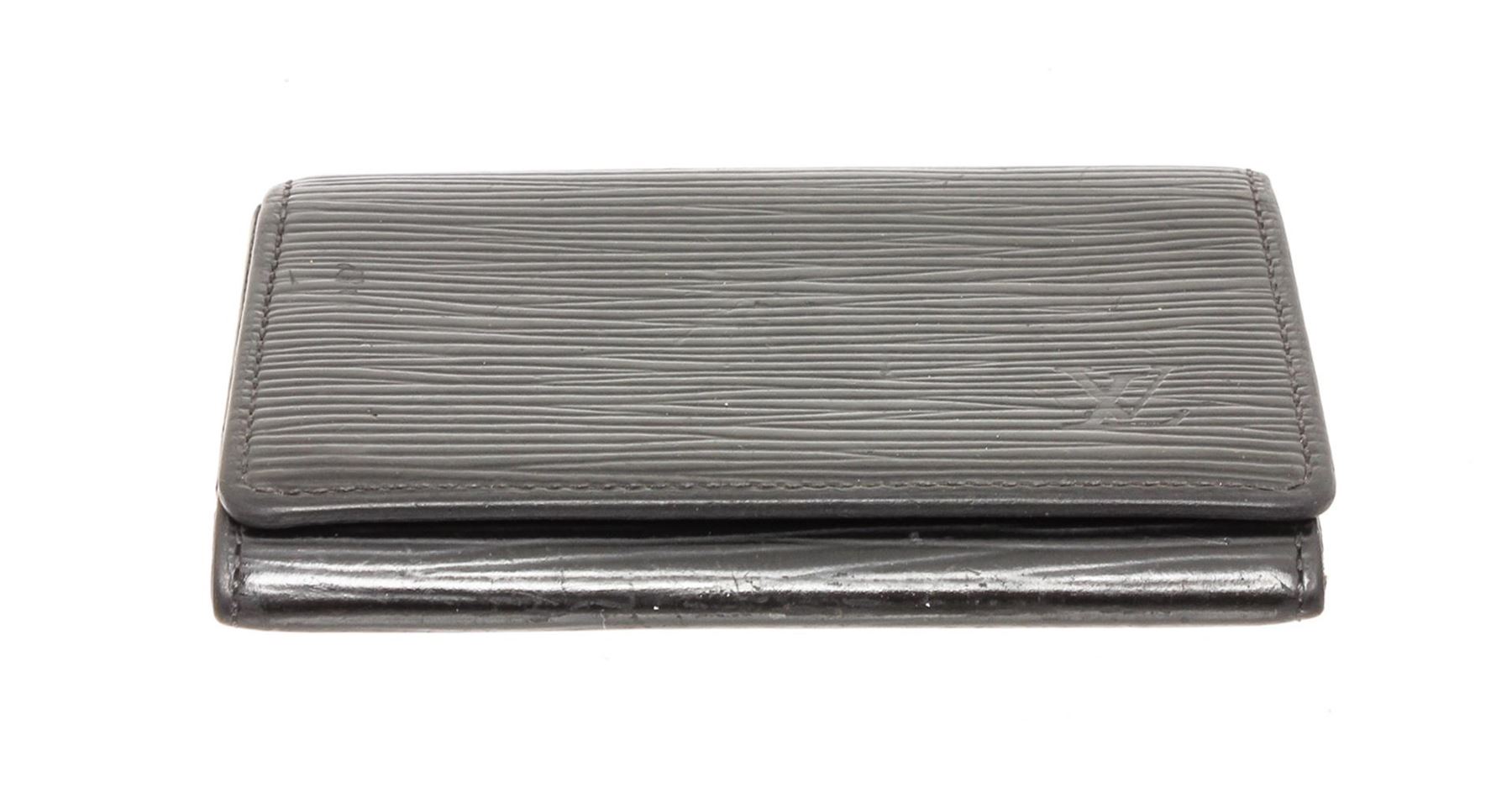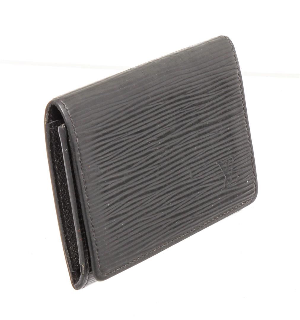 Black Epi leather Louis Vuitton Business card holder with brass hardware, single card slot under front flap, tonal leather lining and snap closure at front flap. Please noter: Initial A stamped on interior flap.