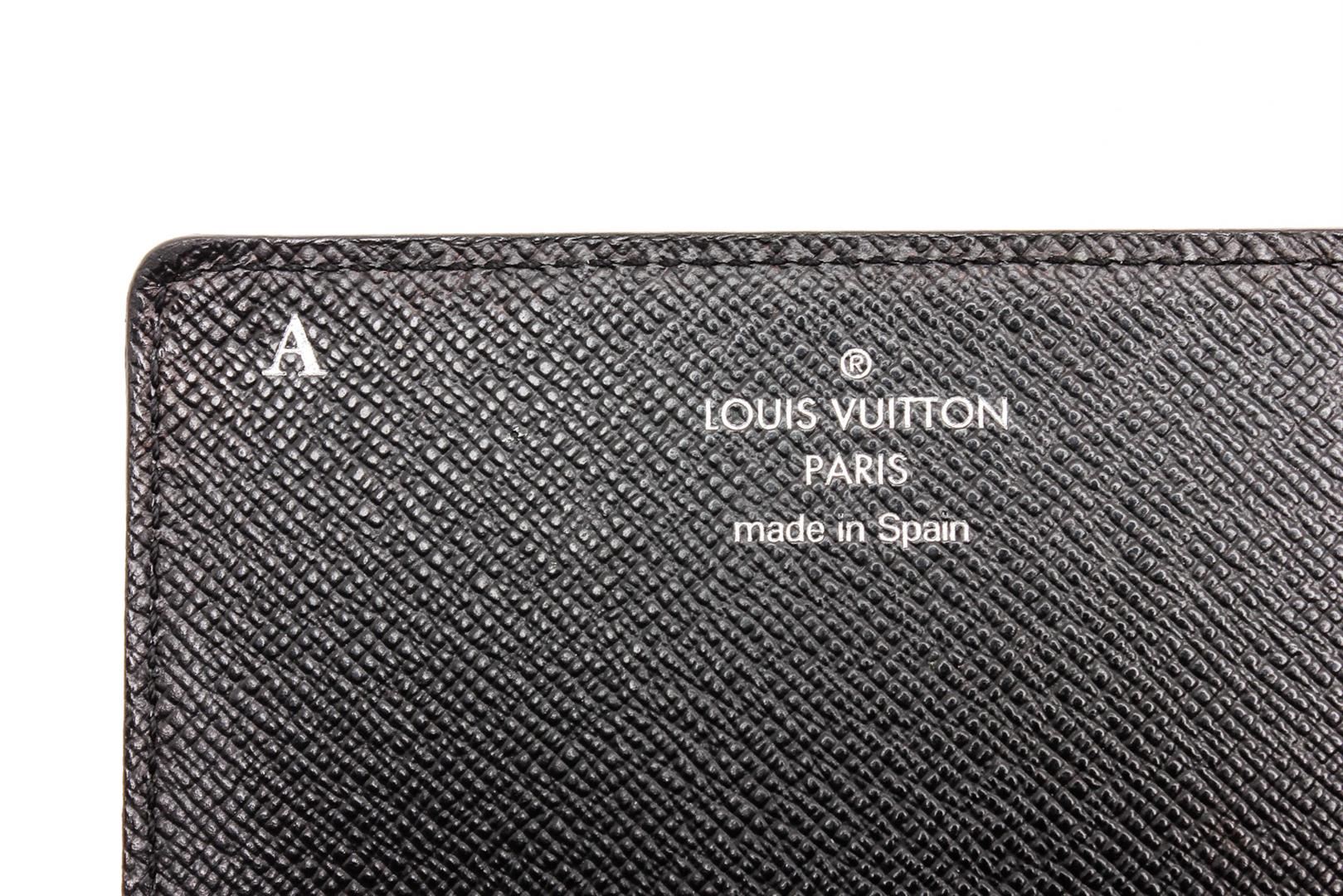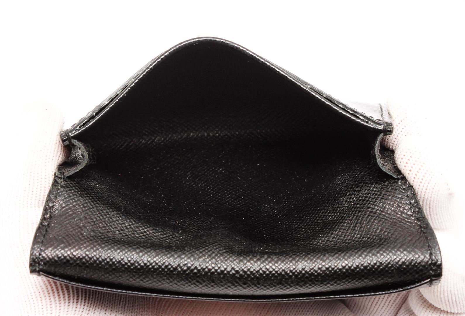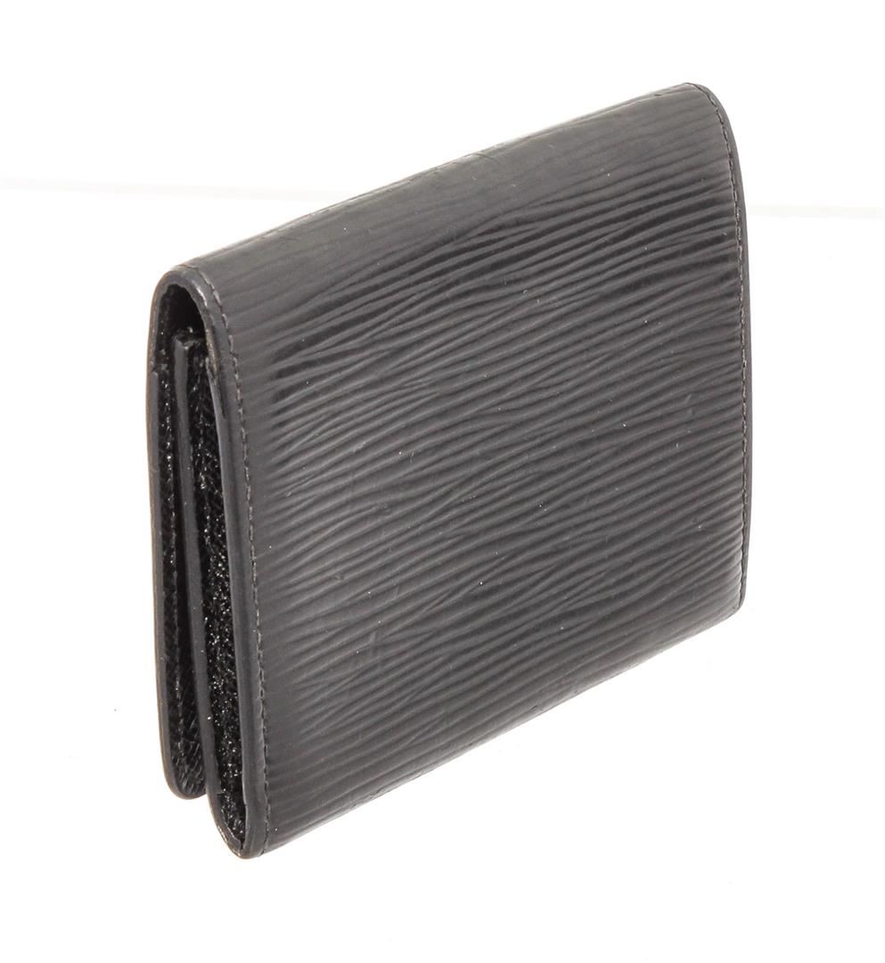 Black Epi leather Louis Vuitton Business card holder with brass hardware, single card slot under front flap, tonal leather lining and snap closure at front flap. Please noter: Initial A stamped on interior flap.