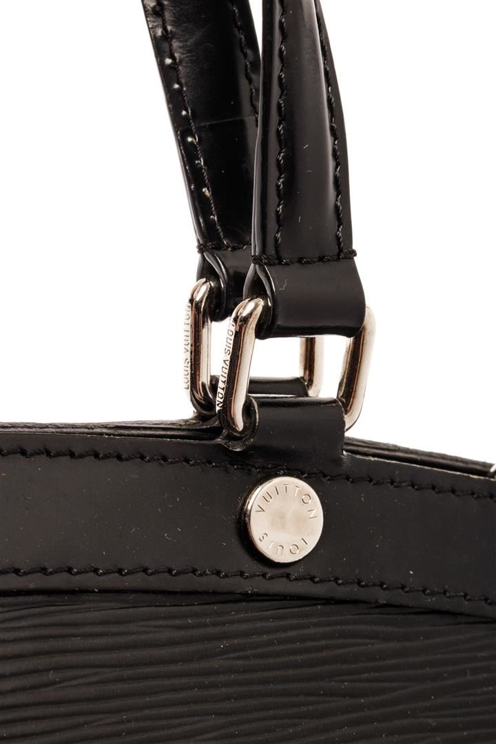 Louis Vuitton Black Epi Leather Electric Brea MM Satchel Bag. All available information is listed in the description and shown in the photos. Louis Vuitton Black Epi Leather Electric Brea MM Satchel Bag, silver-tone hardware, flat handles & single adjustable shoulder strap, canvas lining & three interior pockets, zip closure at top, protective feet at base. Condition Details: Some surface scratches, tarnishing on protective feet, minor wear on handles. Height: 9.5" Width: 13.25" Depth: 5", Handle Drop: 4.5", Shoulder Strap Drop: 16" / 24.13 x 33.65 x 12.7 Cm
