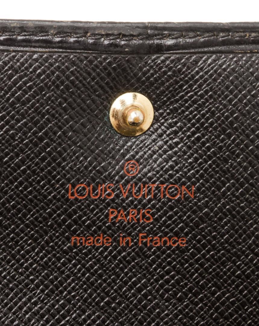 Black Epi leather Louis Vuitton Elise compact wallet with brass hardware, embossed monogram accent at front face, single exterior pocket featuring snap closure, tonal leather lining, single bill compartment, six card slots and snap closure.